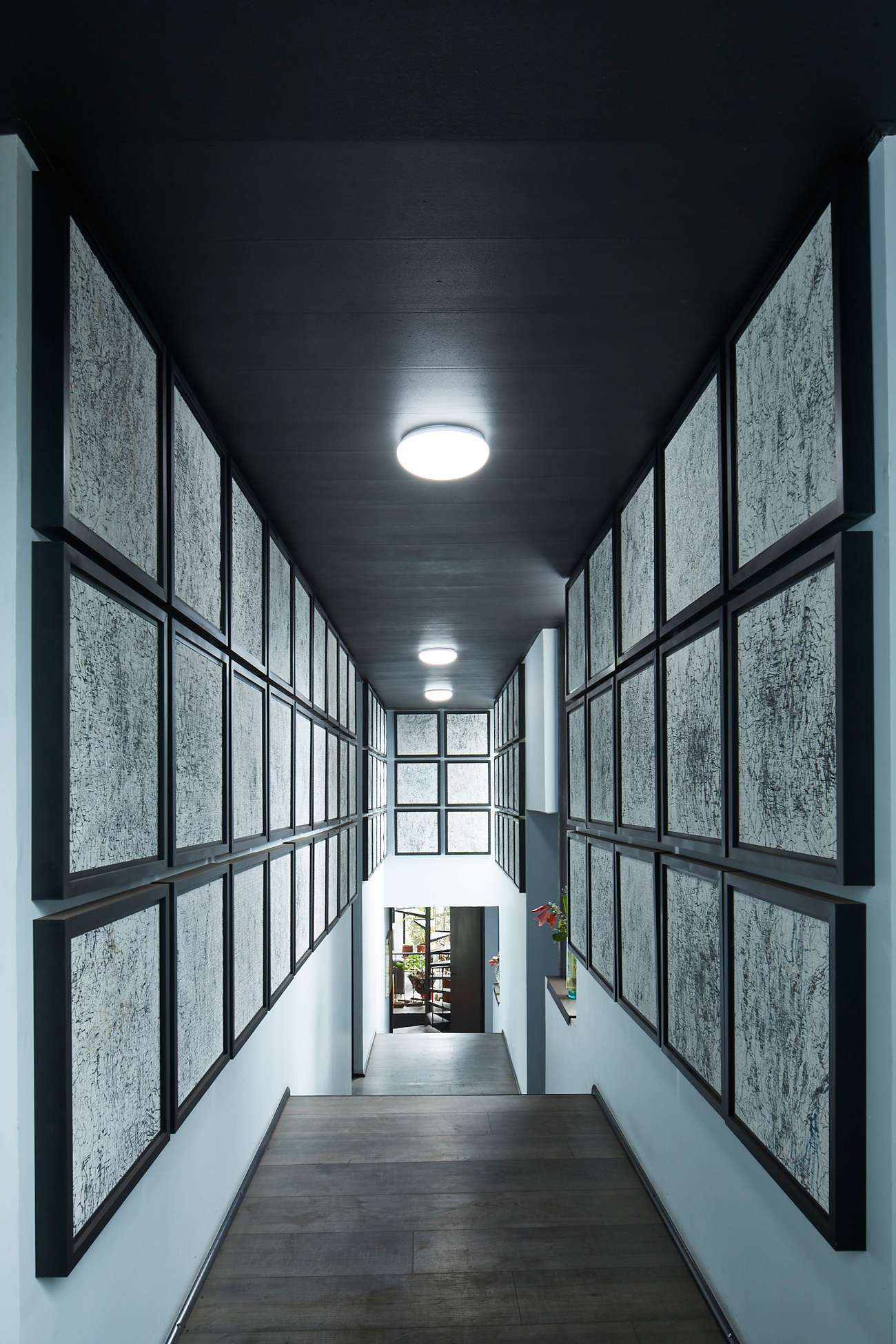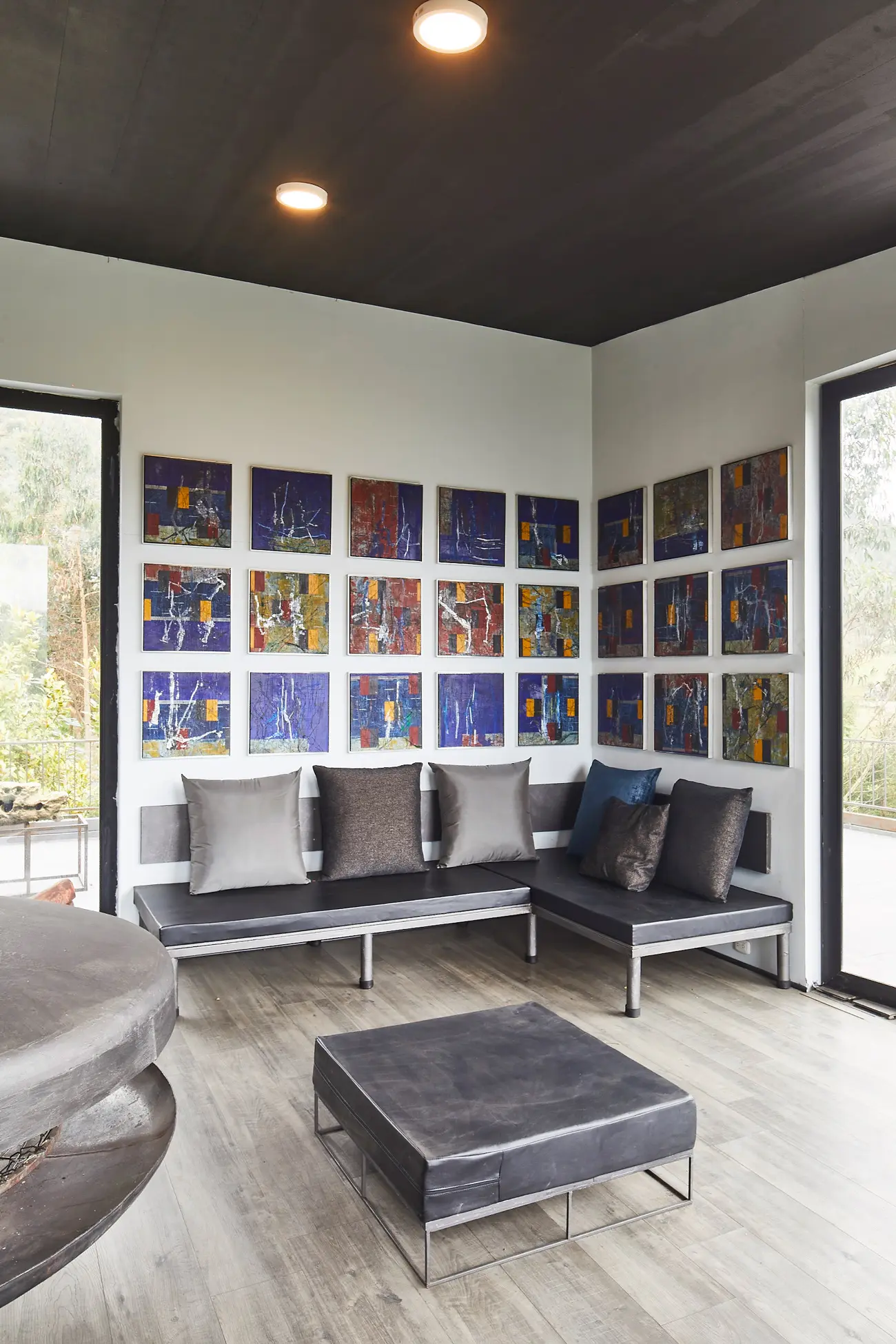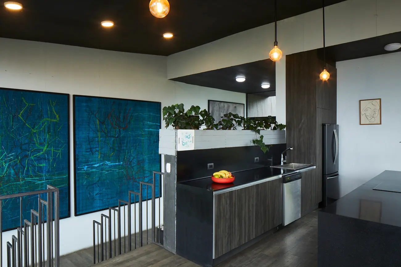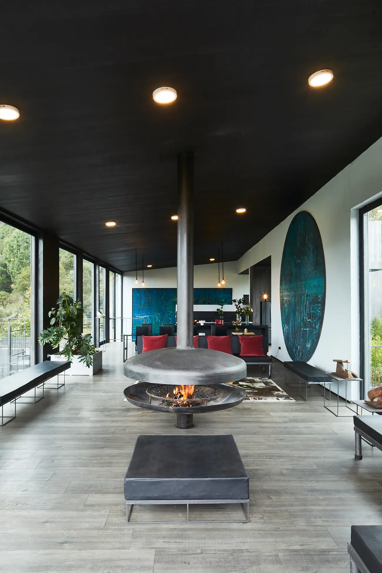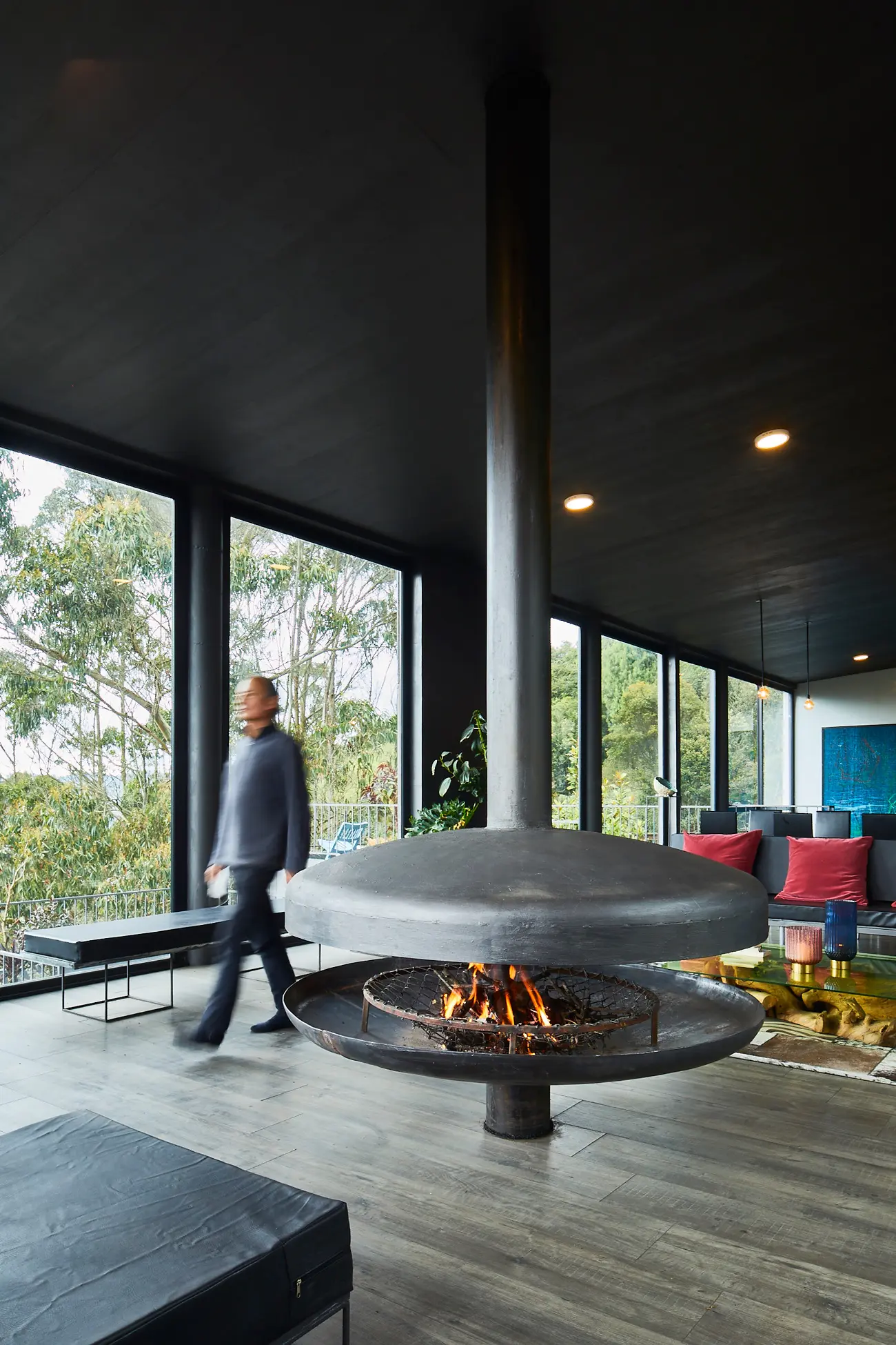 En esta, nunca va a ocurrir eso”. Desde este cálido umbral de acceso el espacio desvela ya lo que ocurre en su interior. Grandes ventanales ubicados en los extremos se abren hacia las montañas y capturan el paisaje; sus marcos y su geometría fragmentada enmarcan las visuales y recuerdan la obra del artista. La zona social, diáfana y continua, disfruta del paisaje, de sus constantes mutaciones, del intenso verde perdido entre las nubes, abrazado por la neblina o bañado por el sol. El piso, laminado de madera del tono de la tierra, se funde con los colores del entorno, mientras que el cielorraso oscuro, construido en PVC y pintado con grafito, desaparece por completo para dejarles todo el protagonismo a las montañas. Los días fríos ven encenderse la enorme chimenea central. Inspirada en una imagen de una revista Selecciones de los años cuarenta, está construida de hierro.