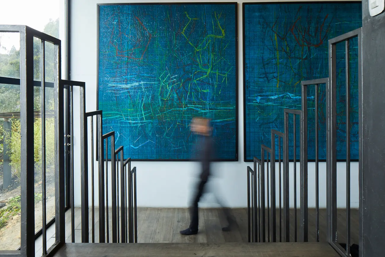 Los reflejos de la montaña sobre el comedor son exhibidos en sus pinturas, como se observa en la obra circular de gran formato que preside la zona social. La incidencia fuerte y directa de la luz que ingresa por los grandes ventanales de su nuevo estudio toma el lugar de aquella luz cenital, neutra y tranquila, y se expresa a través de sus pinturas más recientes. Su casa, su taller, su pintura… “no se pueden desligar”. ■