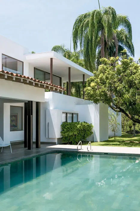 Dos pabellones blancos, uno a continuación de la sala de entretenimiento y otro junto a la zona social, establecen un diálogo formal con el gran tejado principal. Composiciones de planos desfasados, que recuerdan la casa Schröder de Gerrit Rietveld en Utrecht, Holanda, acogen en un volumen el cuarto de ropas, el alojamiento del personal y el equipamiento técnico, en el otro ubicaron cuatro habitaciones de invitados y la alcoba principal en el segundo piso, abierta por dos de sus lados a una terraza cubierta asomada a los jardines y la piscina, esta última concebida como la continuación al aire libre del ambiente social y rodeada por una terraza enchapada en mármol Sinú Veta, material que usaron en todos los pisos de la casa.