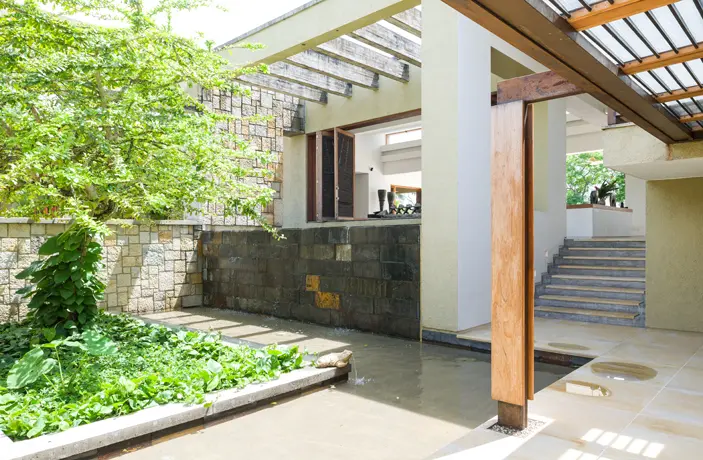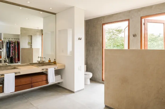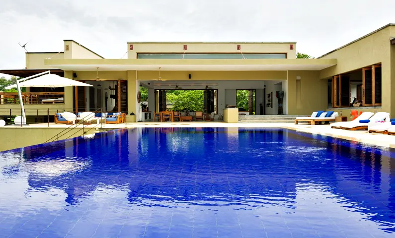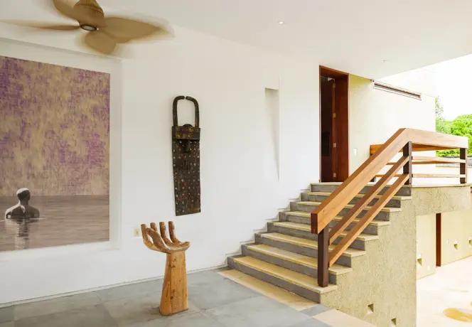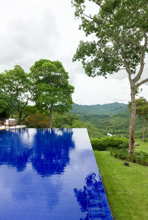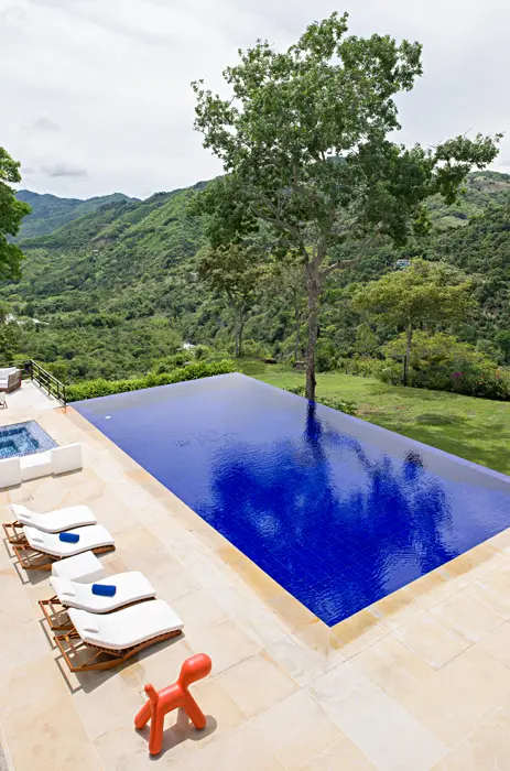Su elemento diferenciador es el corte de la vivienda en la piscina, que la hace parecer suspendida, por lo que da la sensación de ser una “casa en el aire”. Diseñada en forma de “L”, la piscina es perpendicular a la zona social con un sin fin que se funde con un árbol en primer plano y la vista del cañón de fondo. El azul de la piscina contrasta con el resto de la casa, que tiene colores y materiales muy equilibrados, como el gris del piso de cemento, el beige en los baños y la madera y el blanco de los muros.