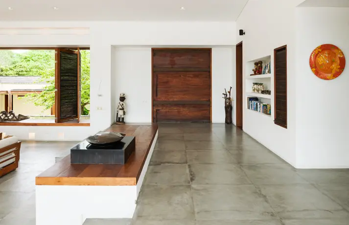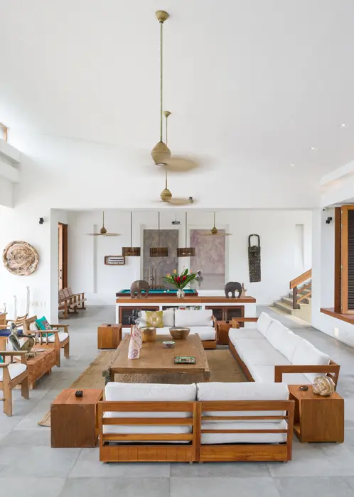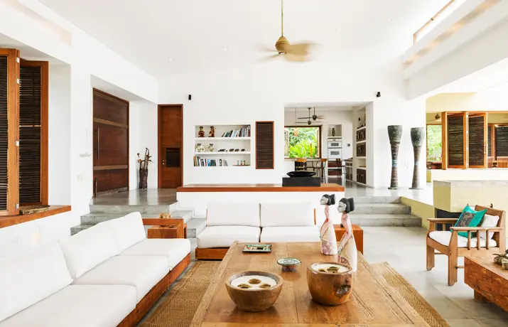 Los espacios de la vivienda son abiertos y para generar una ventilación cruzada existe una gran ventana entre el patio interior y la zona social. Esta última se desarrolla en un nivel intermedio ya que la alcoba principal se encuentra medio piso arriba y las otras cuatros habitaciones están medio piso abajo al igual que el patio, que se despliega como el espacio articulador y organizador de la construcción lo que lo convierte en el área arquitectónica más importante de la casa.