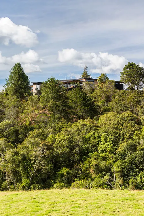 Entrar se traduce aquí en más que atravesar una simple puerta para convertirse en un evento a cielo abierto. Los volúmenes de concreto, madera, piedra y vidrio que contienen la morada buscan el paisaje a través de una geometría que se contorsiona persiguiendo la geografía.