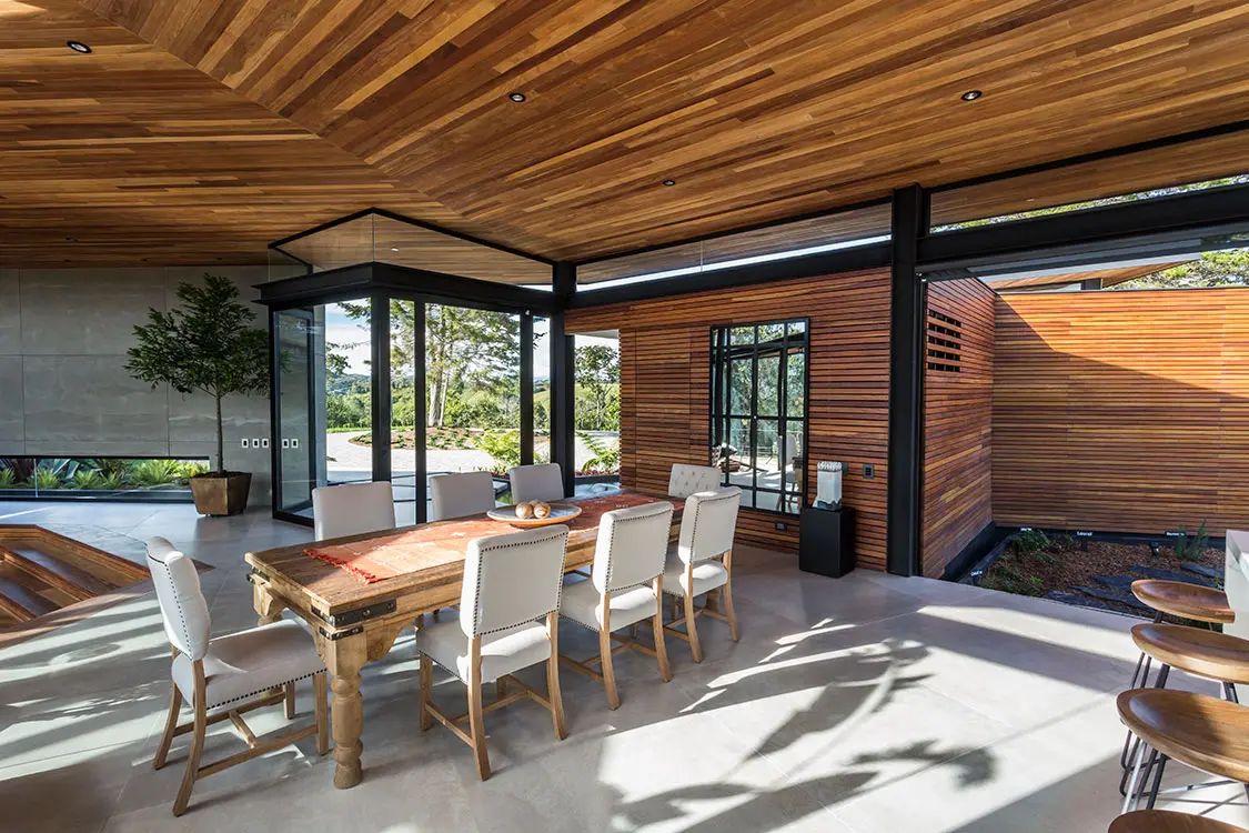 La madera, siempre presente, acompaña cada rincón y propicia un telón de fondo para el mobiliario y la decoración interior. Esta estuvo a cargo del estudio de diseño 5 Sólidos. La composición que resulta de la arquitectura, la disposición de los muebles y la vegetación de los jardines, diseñados por el paisajista Jorge Mesa, recuerda una versión tropical del espacio doméstico de la arquitectura moderna de la década de 1950.