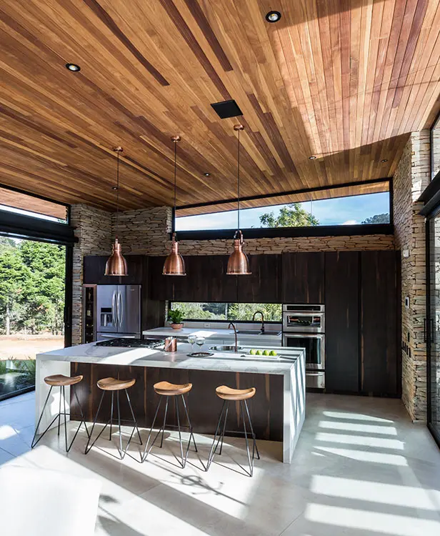 Los materiales de las fachadas de esta casa en la montaña en Medellín entran también a la casa para revestir muros, pisos y cielos en una estrategia que se plantea desde el diseño arquitectónico para que el exterior y el interior queden amalgamados.