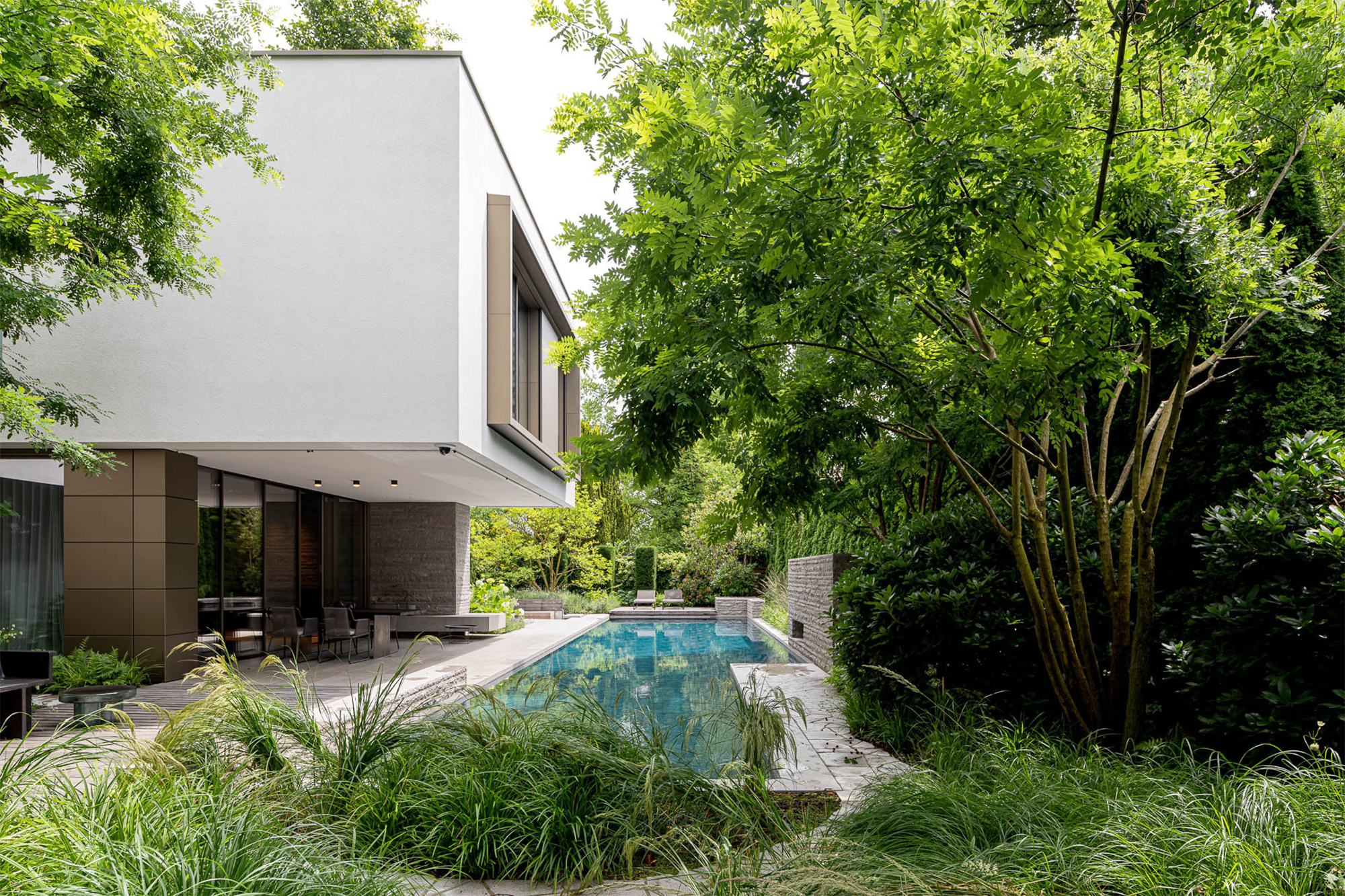 Los bordes laterales están ocultos por una serie de árboles de dosel recién plantados, que brindan protección solar natural. En el nivel del suelo, un plano de planta abierto fluye libremente de este a oeste a lo largo de la piscina. Las ventanas corredizas de piso a techo permiten vivir dentro y fuera durante todo el año.