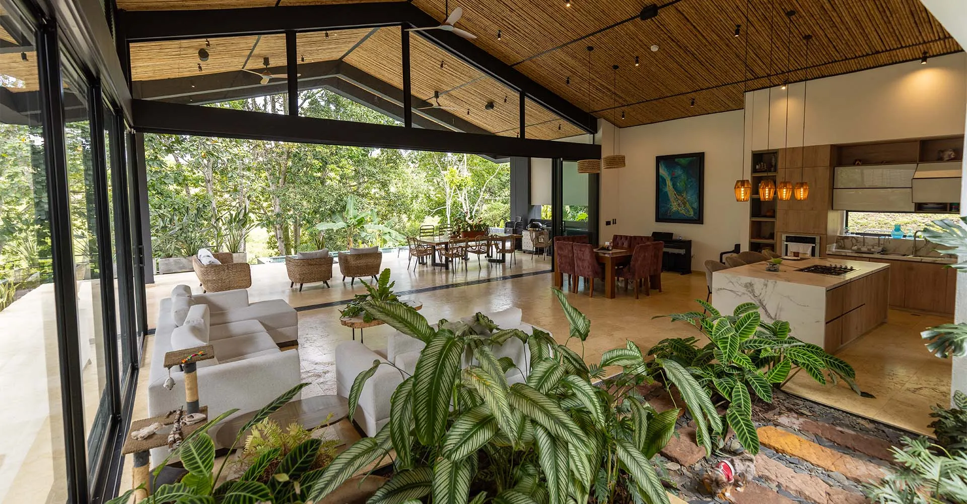 Diseñada y construida por Construcciones Integradas, una firma pereirana con amplia experiencia en el desarrollo de proyectos inmobiliarios, esta casa de un solo piso, localizada en el sector de Cerritos (Pereira), capta la esencia de su entorno privilegiado, donde la flora y fauna local transitan libremente.
