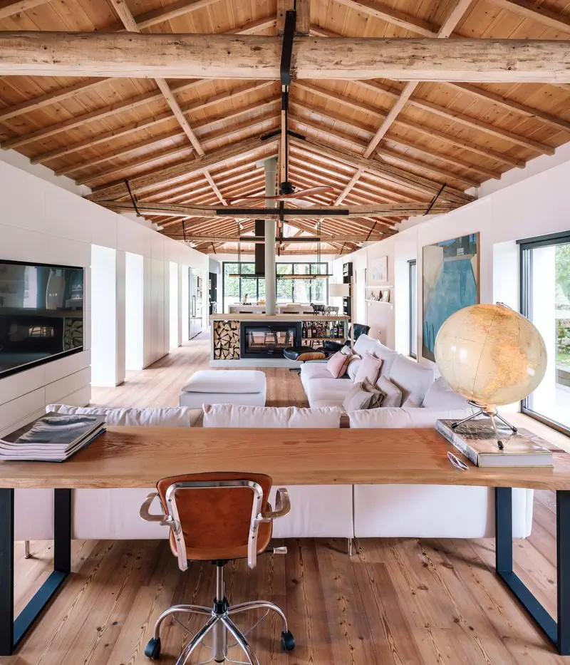 La secuencia de usos compuesta por cocina, comedor, chimenea, sala de estar, oficina, estanterías se desarrolla en un patrón lineal, bajo el mismo techo, caracterizado exclusivamente por los elementos específicos de cada uso, siempre estando dentro del mismo punto neutro y global.