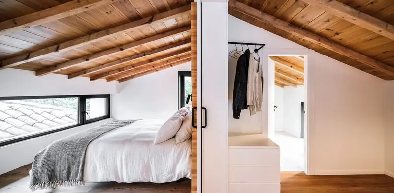 Solo el dormitorio principal, oculto detrás de una estantería, está separado del espacio general. Un segundo dormitorio, accesible mediante el uso de las escaleras exteriores en el pasillo original en la entrada del edificio se encuentra por encima de la principal, para completar la altura del edificio anexo. Para reforzar la idea de un plano de planta abierto, se incorpora una función de almacenamiento en el perímetro del espacio, liberando espacio interior y resaltando el techo de madera tradicional.