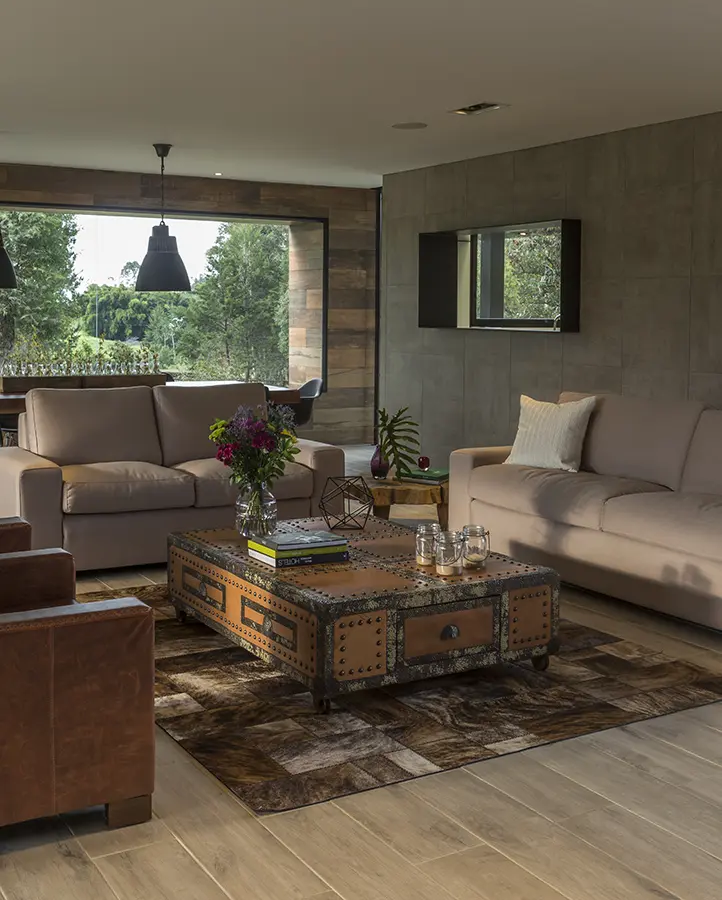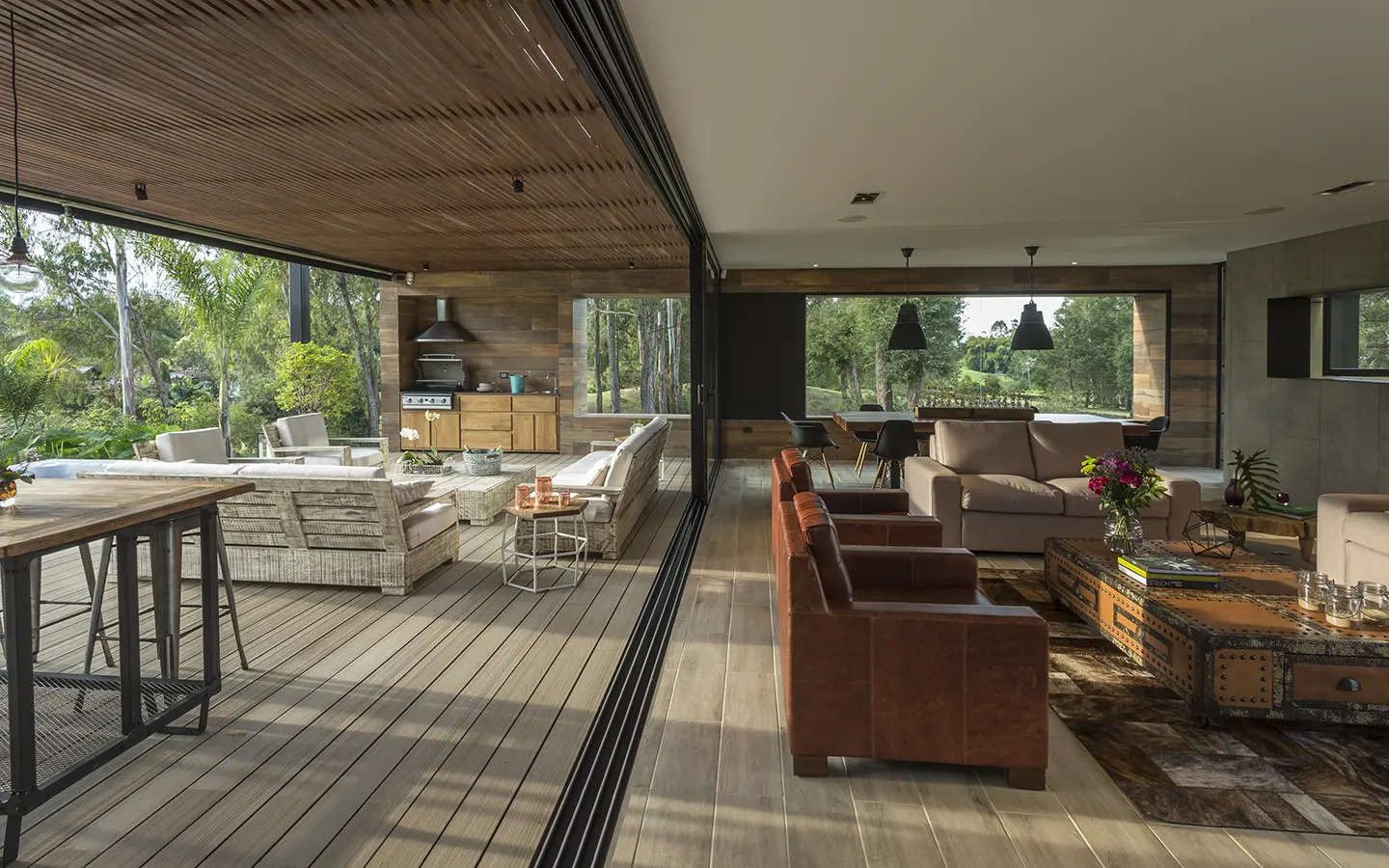 A través de las vidrieras que vinculan el salón exterior con la zona social interior se establece una relación de continuidad entre estar adentro, afuera y habitar este espacio de transición. Un BBQ integrado define el uso de este ambiente intermedio como un lugar de reunión rodeado de paisaje. La morada se construye para diluirse con los árboles que la envuelven, en un paisajismo planteado por el mismo arquitecto, que trabajó en el pasado para el Jardín Botánico de Medellín. El interior se define de una manera sencilla.