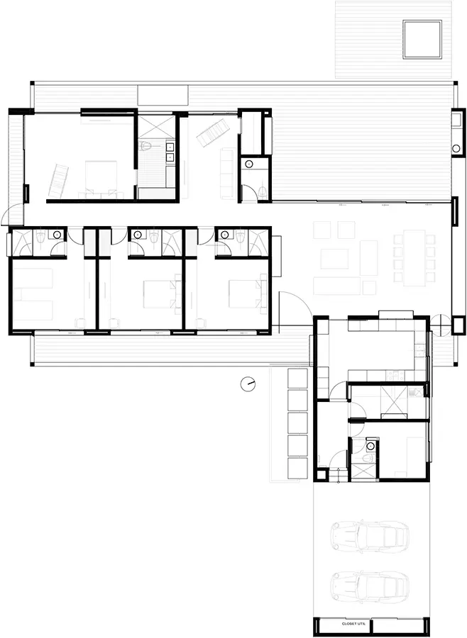 En esta propuesta hay una obsesión por lo ortogonal, un interés por el prisma rectangular como expresión volumétrica de la arquitectura. La zona de servicios está agrupada en uno de estos cuerpos, quedando separada de las partes más privadas de la casa. Las habitaciones se encuentran en el extremo opuesto, articuladas por un corredor que se abre en la sala de estar.