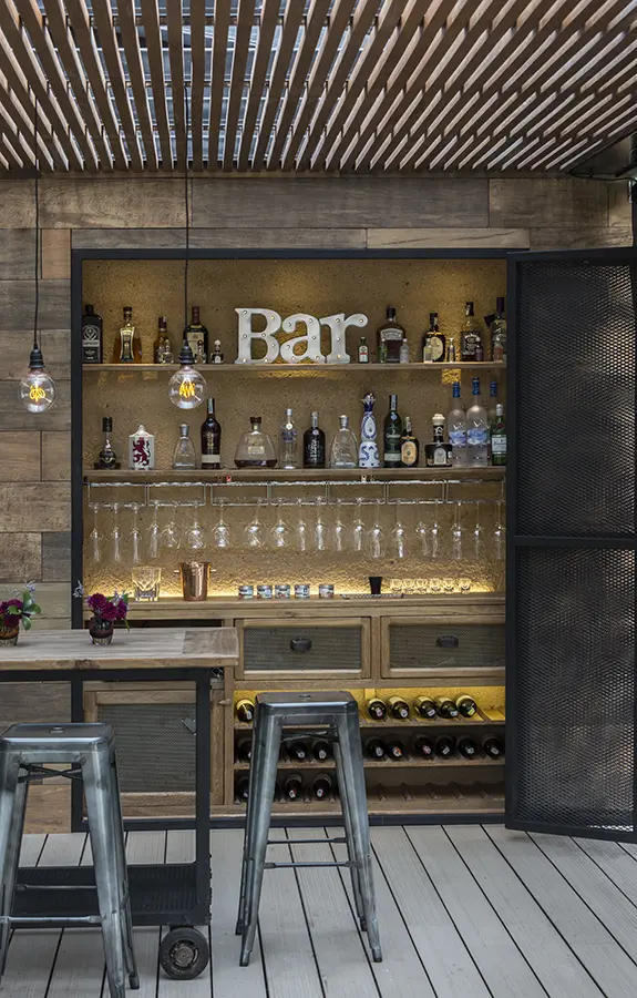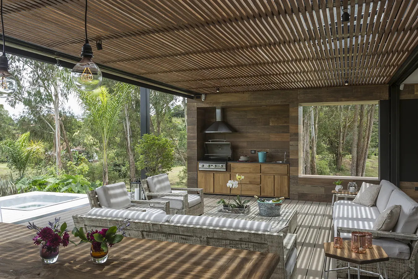 En medio de estas dos áreas, privada y operativa, aparece un salón comedor integrado a un segundo salón exterior, cubierto por una pérgola de madera que resguarda del sol y proyecta líneas de luz sobre los pisos, muros y mobiliario. Este espacio, característico de las viviendas campestres de recreo, da cuenta de una de las apuestas fundamentales de Uribe Mesa en el proyecto: establecer una relación difusa entre el exterior y el interior.