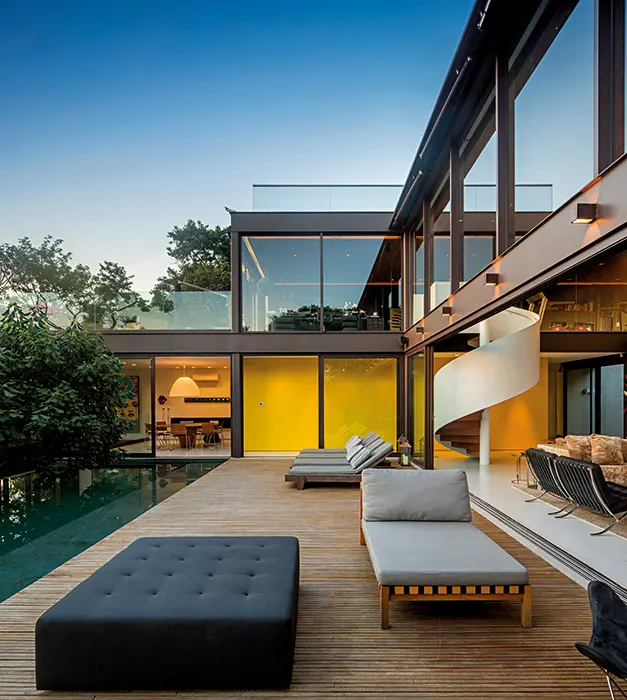 La zona social se vincula al comedor a través de una circulación vidriada que integra el deck, una piscina con borde infinito y un jardín lateral. El área del comedor se abre directamente al exterior. Así que, contenida principalmente por paneles de vidrio, esta casa parece estar sumergida en el paisaje circundante. Esto no significa que la arquitecta haya dejado de lado la sensación de calidez que debe percibirse en una casa de familia. “Para el interior elegí crear escenarios más introspectivos, basados en luz indirecta, especialmente en el salón, con su doble altura, y usando acabados menos fríos, como la madera. Después de todo, la casa debe verse y sentirse como un hogar”. Casa de cristal de Fernanda Marques