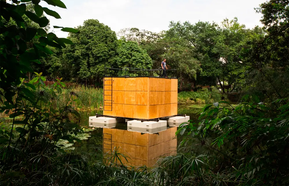Fue así como surgió este prototipo 1:1 de la casa imaginada de Mateo López; un modulo flotante compuesto por paneles de madera y una serie de objetos y mobiliario en papel, madera y cartón, pensados para suplir las necesidades básicas del artista.