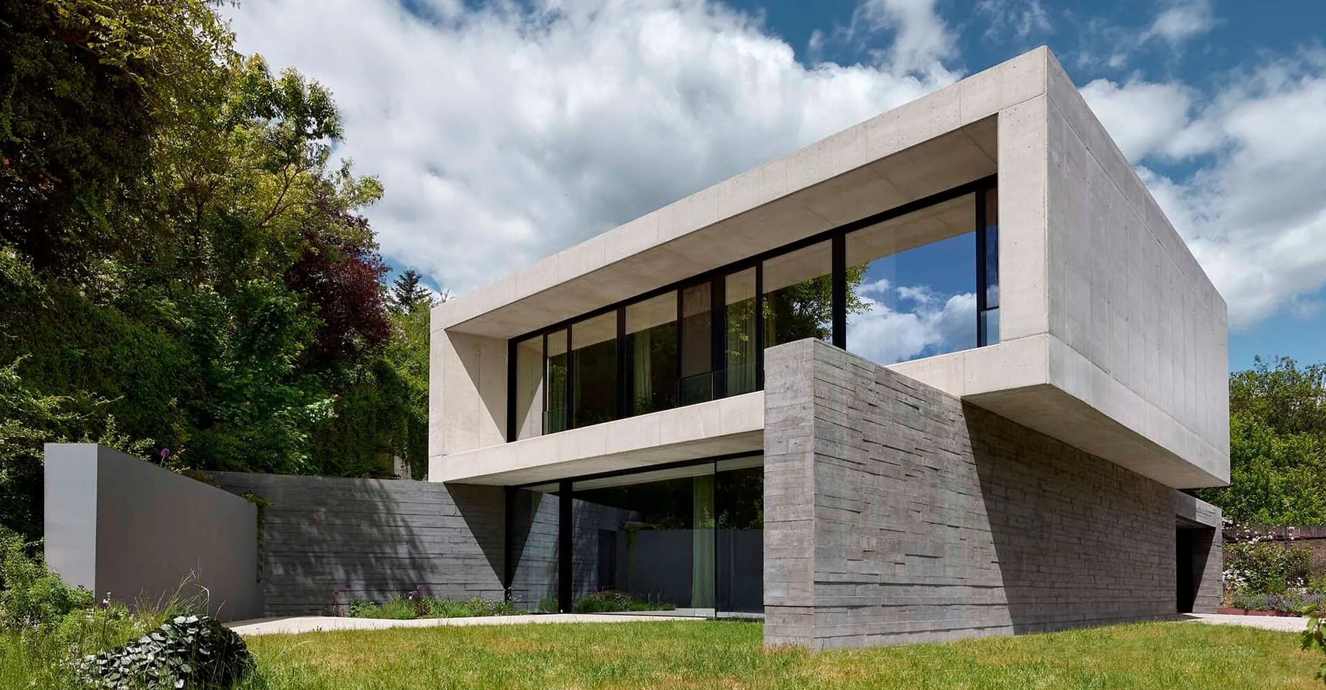 Gracias a los muros extendidos, tanto las habitaciones como la sala de estar del jardín se convierten en un oasis de paz y privacidad. La intención de separar visualmente la planta baja de la planta alta se ve subrayada por dos tonos y texturas de hormigón distintos. La base, hecha de hormigón encofrado y pigmento, es oscura y táctil, mientras que la planta alta es clara y lisa. La planta baja se integra con el jardín; sus muros se integran a la perfección con las estructuras de contención de la ladera, mientras que el volumen superior, casi blanco, se funde con el cielo.