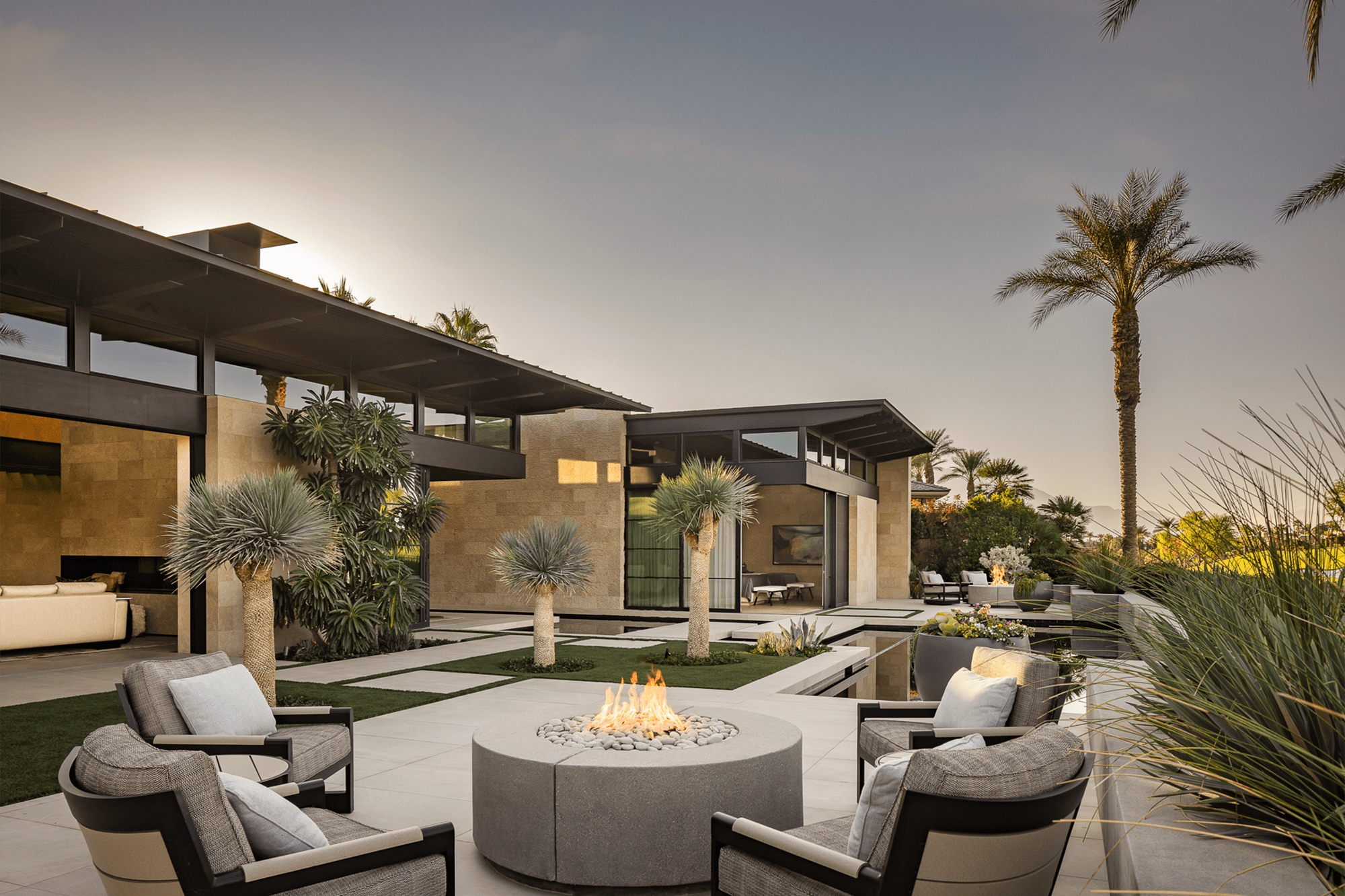 Mientras tanto, en el interior de la residencia de 7.306 pies cuadrados, las personas son recibidas con una vista a lo largo de un estanque reflectante orientado al norte, que sirve como puente entre las áreas públicas y privadas de la casa, que se extiende hacia el campo de golf y el club de campo.