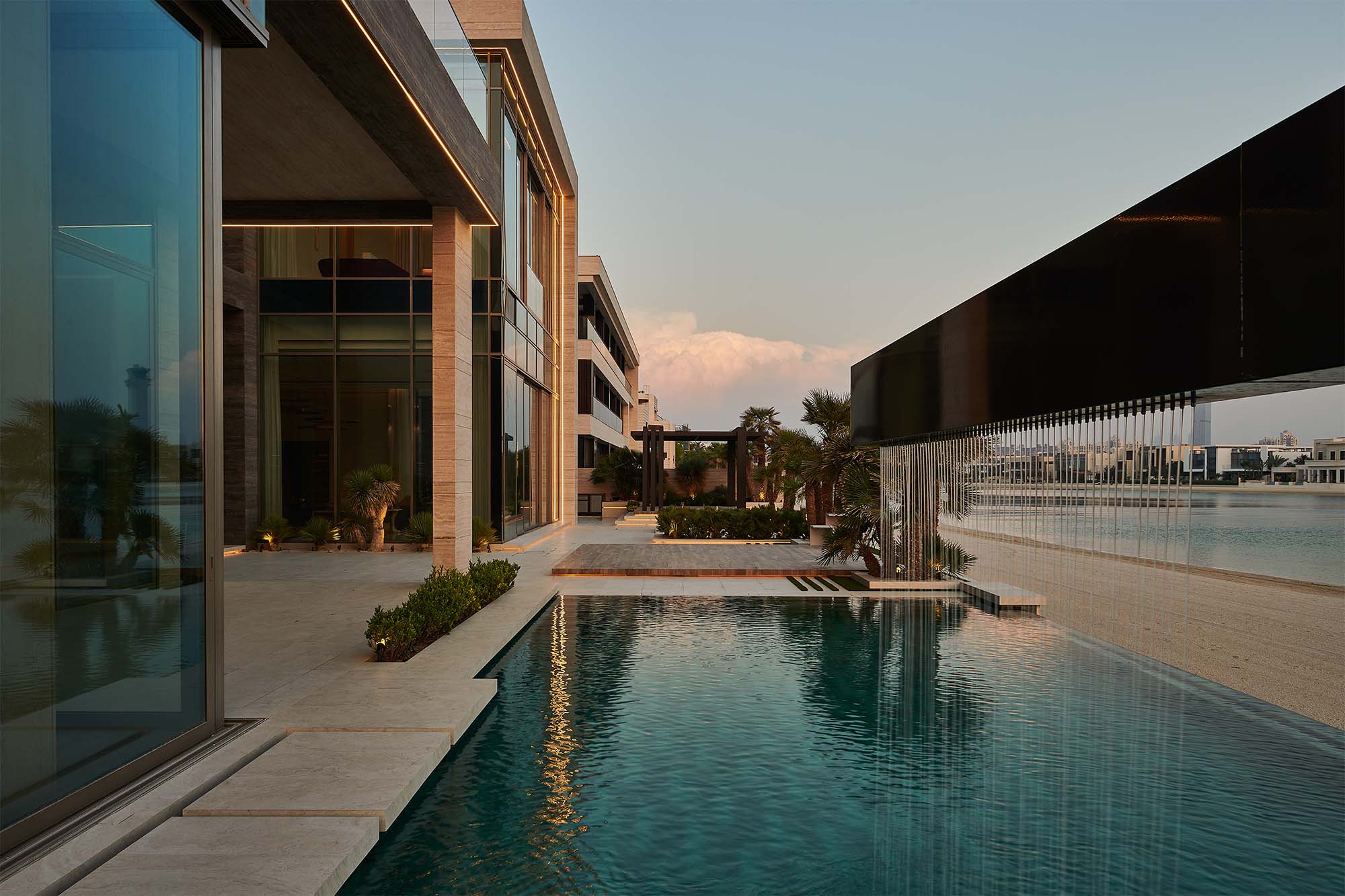 En esta obra, una imponente fuente marca la transición de lo público a lo privado: una viga de piedra en voladizo deja caer una cortina de agua sobre una piscina turquesa, ofreciendo un preludio minimalista al lenguaje arquitectónico interior. Este gesto —a partes iguales de serenidad y fuerza— se refleja en toda la residencia, donde la grandeza se expresa sin ostentación.