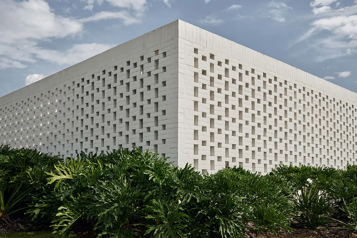 Pero es hilada también por la manera en que está construida: los muros que delimitan los diferentes patios son tejidos en ladrillo para conformar un ingenioso sistema de celosías. Esto con el fin de proteger del deslumbramiento solar y, al mismo tiempo, permitir el paso de la luz y el aire.