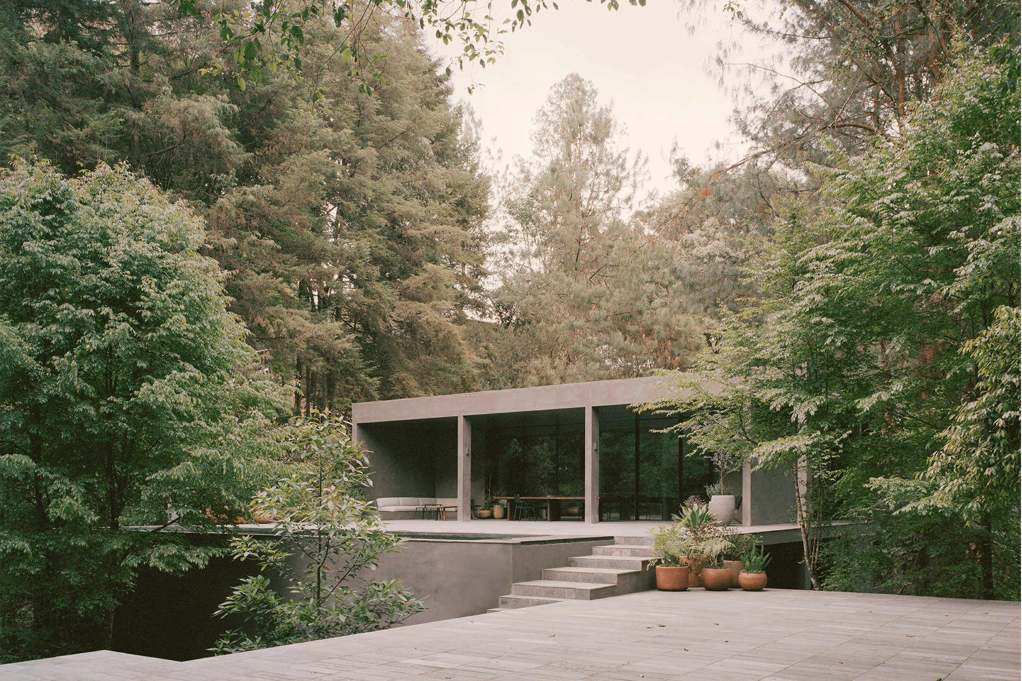La residencia se adapta a la topografía natural del lugar absorbiendo la pendiente y con una excavación mínima. Los arquitectos, la firma Pérez Palacios Arquitectos Asociados, optaron por elevar los espacios públicos un nivel por encima del suelo, introduciendo una serie de plataformas que se pueden experimentar de diversas maneras junto con la naturaleza.