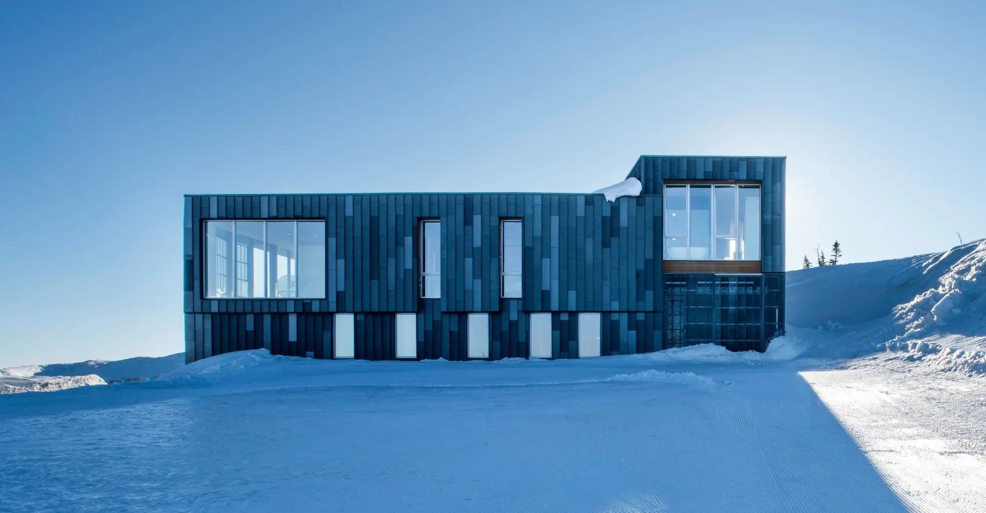 Además, el sitio de gran altitud está completamente expuesto y recibe una nevada anual promedio de 225 pulgadas, lo que requiere que la casa esté diseñada para soportar velocidades de viento de 110 mph y soportar una carga de nieve de 228 lb/pie cuadrado.