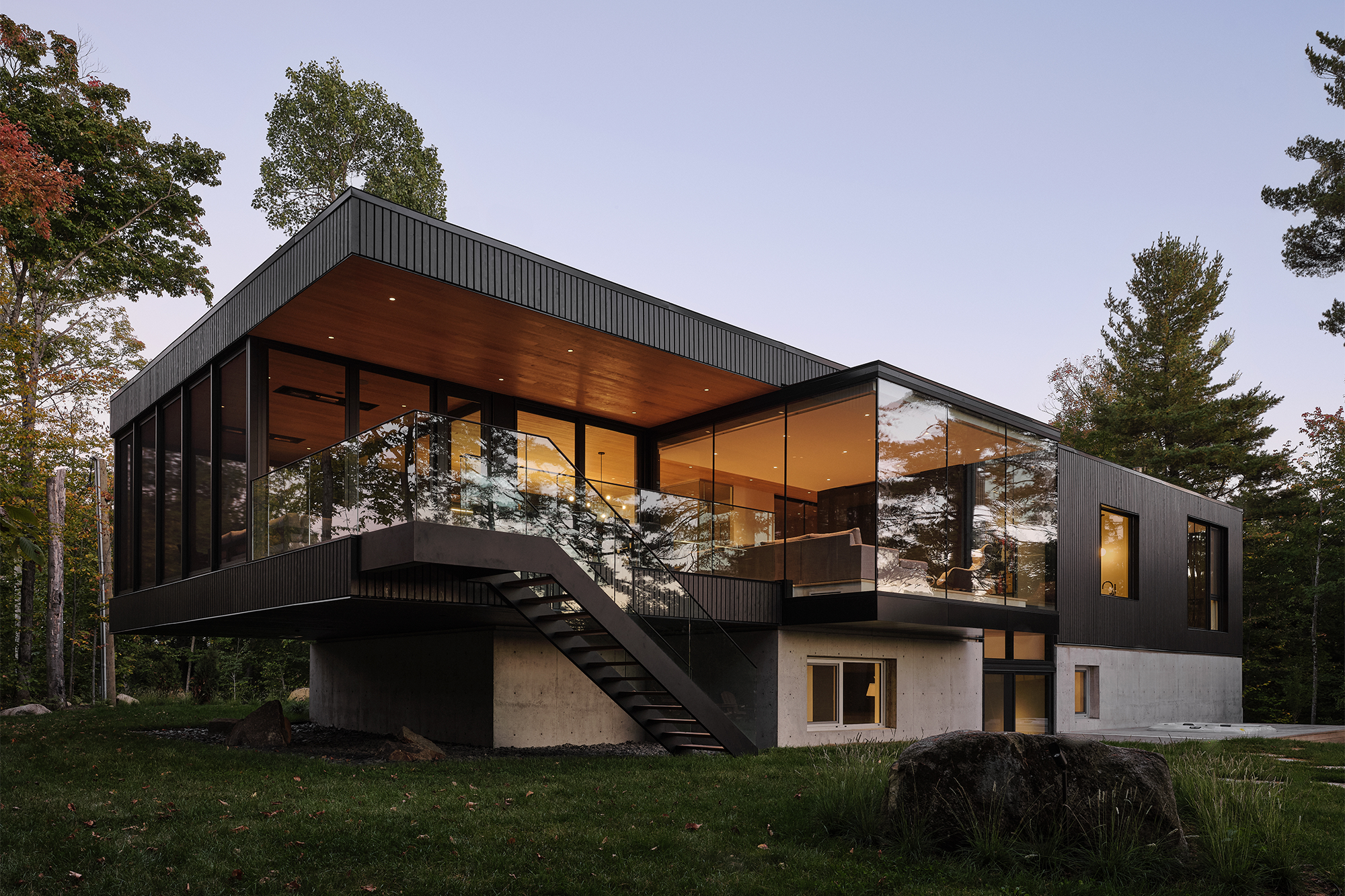 Esta casa unifamiliar en Quebec de 330 m² está situada en el punto más alto de un terreno de cuatro acres densamente arbolado en las Laurentides, aproximadamente a 65 km al norte de Montreal.