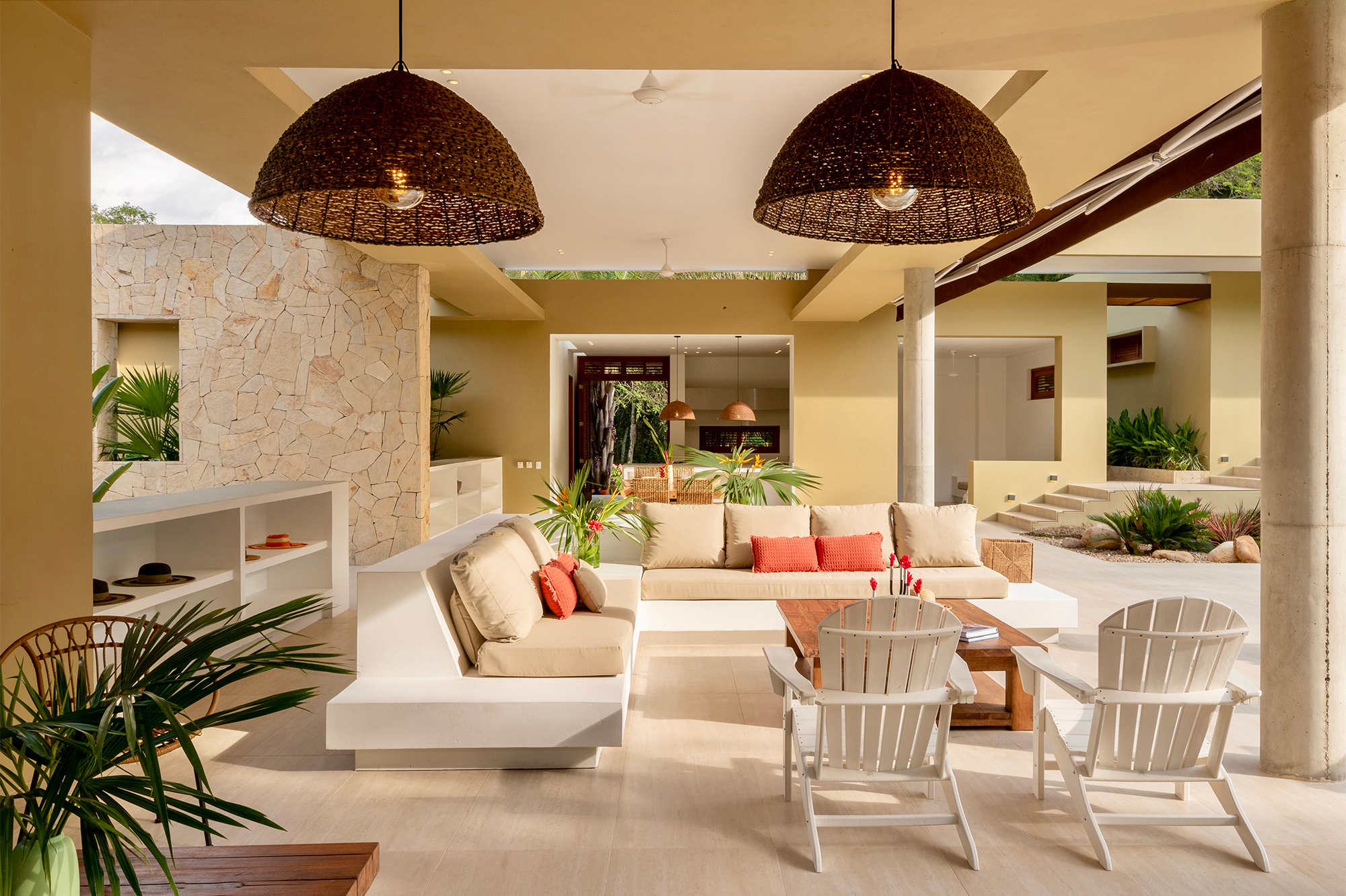 En la parte baja ubicaron las zonas sociales, abiertas y continuas, cubiertas a partir de planos horizontales profundos que generan sombra y protegen de la lluvia, mientras permiten el paso de la brisa para tener confort térmico.