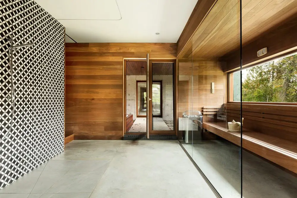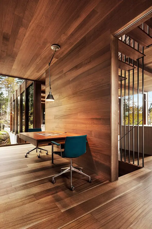 Un nivel más abajo, se encuentra un área pequeña de oficina-biblioteca, adyacente al área de comedor de la cocina. El nivel más bajo de esta «caja» vertical cuenta con una instalación de sauna-spa.