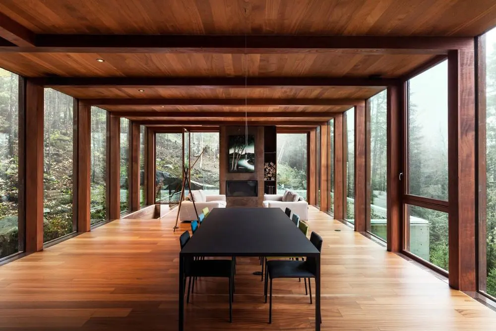 El comedor se expande al aire libre con una terraza construida en el techo de la suite de los huéspedes. El material predominante utilizado en el interior es la caoba, seleccionada por sus cualidades duraderas y por sus ricos tonos. En el salón comedor, los pisos, techos, vigas, marcos de ventanas y gabinetes de cocina están acabados con esta rica madera oscura que recuerda a los árboles que se encuentran más allá.