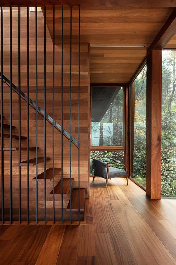 Con la luz cambiando constantemente, los interiores y los exteriores parecen encajar. Manteniéndose dentro de la misma paleta de colores, se introdujo el acero para la chimenea y para el revestimiento exterior.