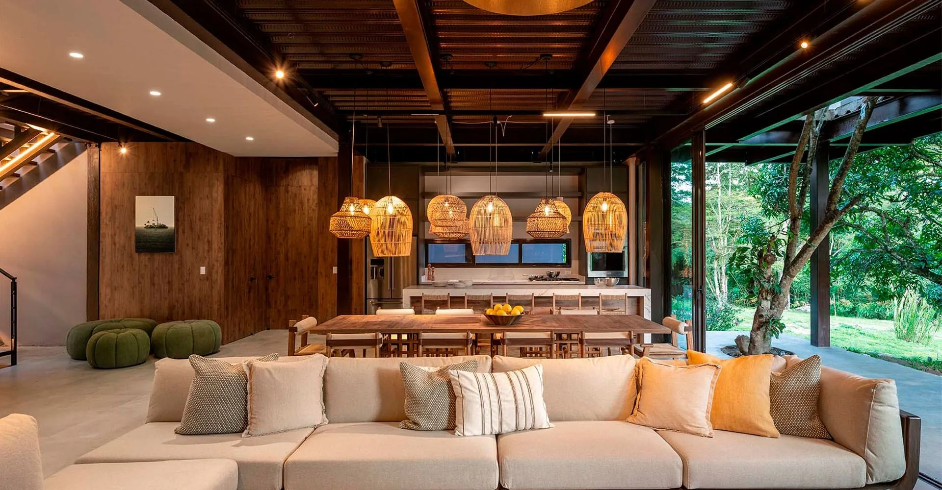 Las lámparas, en su mayoría de fibras naturales, aportan calidez, pero también hay plafones geométricos de madera que rompen con lo esperado. Los sofás, mesas, camas y objetos decorativos son livianos, móviles, pensados para permitir al habitante configurar el espacio según su necesidad, con un solo objetivo: estar siempre orientado hacia la naturaleza. Para el proyecto arquitectónico se definió el uso del steel deck como estructura principal en las placas. Si bien es poco común en viviendas rurales colombianas, el material permitió reducir los tiempos de obra y minimizar el impacto y el peso sobre el terreno, aun cuando requiere apoyos más específicos y ligeros. Expuesto a la vista de quien habita la casa, el material se trató cuidadosamente desde el color y la textura: todo el metal visible se pintó en tonos café, buscando que la estructura se camuflara con el entorno y se alejara visualmente de una estética industrial. “No queríamos que se sintiera como un container ”. Para lograrlo, crearon plafones decorativos que juegan con formas y alturas, e incorporaron patrones inspirados en el bosque. Un gran árbol atraviesa el módulo central de la casa y perfora el espacio sin interrupciones. Se preservó desde el principio del diseño, y en lugar de evitarlo, lo integraron como un gesto simbólico: la naturaleza no se desplaza, se acoge. Como este, otros árboles también se respetaron, reforzando la sensación de que la vivienda no se construyó sobre el lugar, sino desde él. La zona social se despliega en dos niveles.