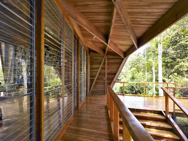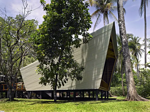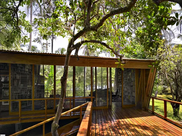 Del interior se destaca la biblioteca, una estantería que es parte de la estructura y cuyas divisiones diagonales se extienden hacia las vigas del techo. Diseño de Gianni Botsford. La casa Kiké Una cabaña de diseño en medio del bosque.