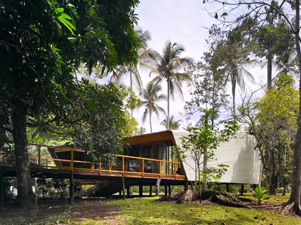 El primero contiene un estudio y espacio habitable y tiene sobre su techo inclinado una cubierta metálica extendida sobre la fachada para protegerla del sol.