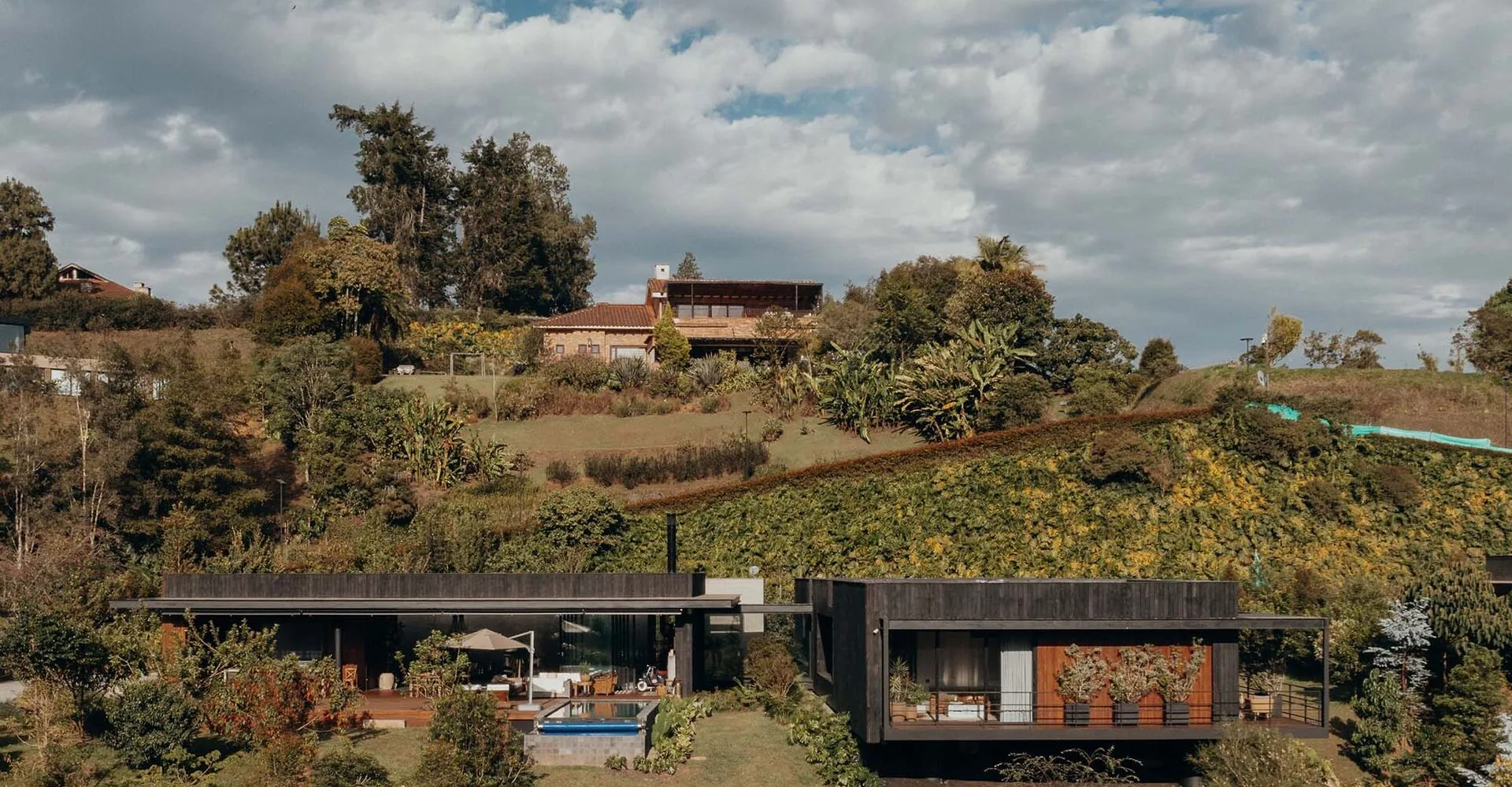 Uribe Mesa, pensando en las condiciones del lugar y la necesidad de cumplir con el programa arquitectónico, ideó una solución basada en la segregación funcional de los ambientes mediante tres volúmenes independientes. El primero está destinado al ámbito social, que incluye sala, comedor y cocina integrados junto a un gran deck —compuesto por una piscina y zonas de permanencia— que se extiende hacia el entorno natural; el segundo lo forman cuatro habitaciones, y el tercero es el módulo de servicios, que contiene otra alcoba y cuatro parqueaderos.