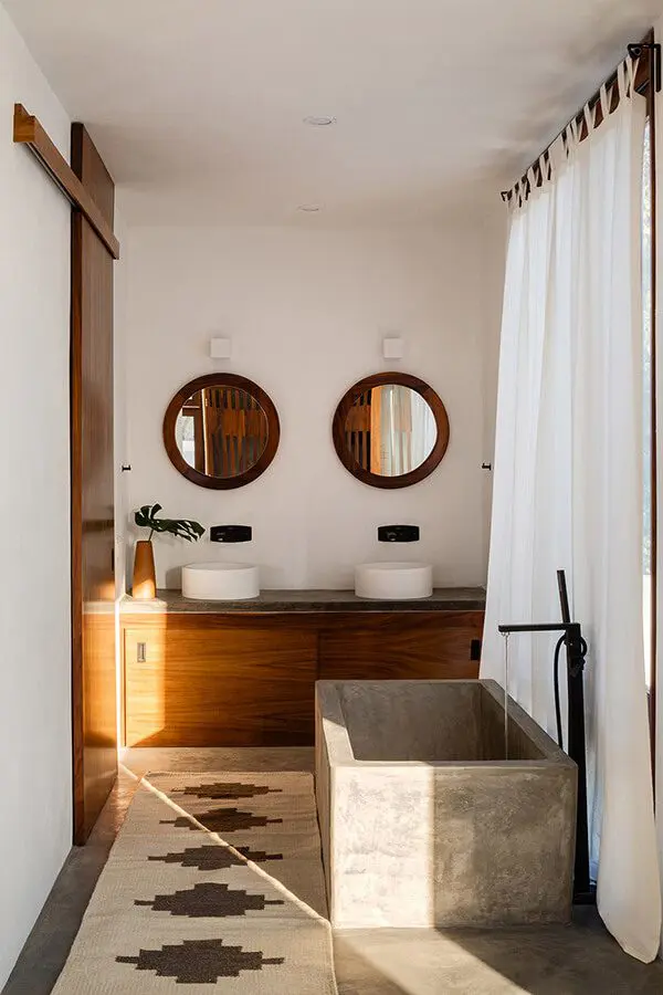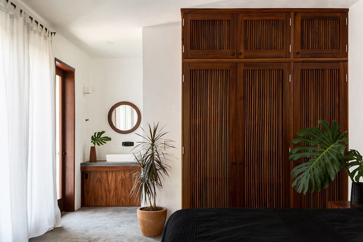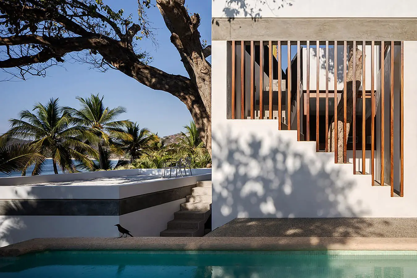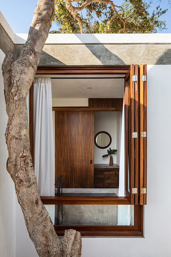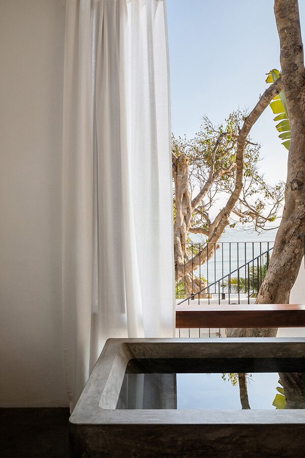 Es por ello que los arquitectos conectaron los diferentes niveles del proyecto mediante una serie de plataformas de concreto que se adaptan a la topografía, junto con caminamientos y jardines vibrantes, en donde la frontera entre interior y exterior se disuelve. La casa principal cuenta con cocina, una sala abierta hacia el exterior que se mezcla con el área de la piscina panorámica, una recámara que cuenta con una tina de concreto pulido hecha en el sitio y una terraza con una vista inigualable hacia el Océano Pacífico.