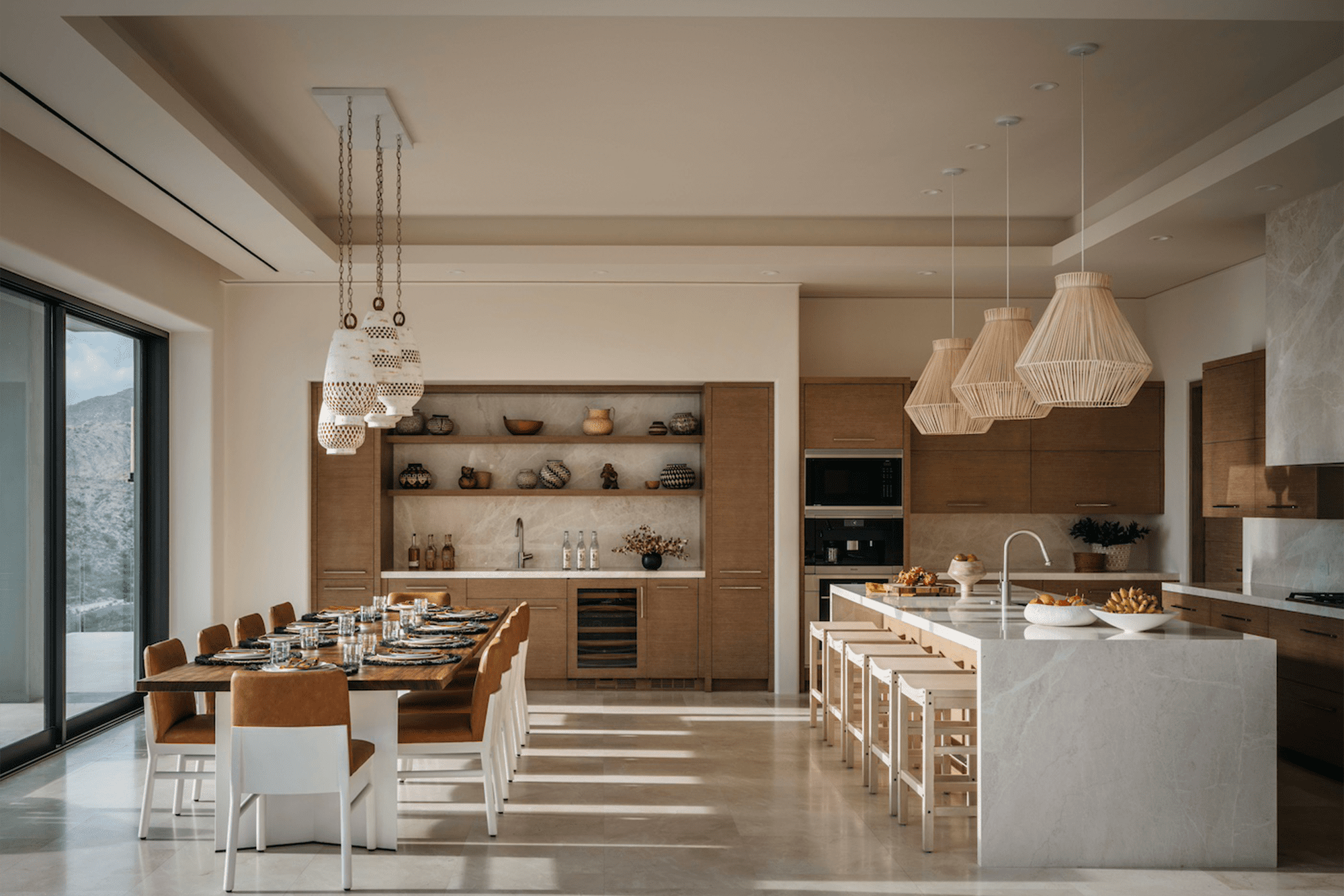 Para el interiorismo, la firma estadounidense Susan Marinello mantuvo las piezas principales de la casa en tonos neutros, con maderas naturales y colores cálidos. “Creamos espacios que se convirtieron en el lienzo para combinar texturas, materiales y elementos que reflejan la cultura de la región. El arte, los textiles y los artefactos especiales se obtuvieron tanto en Estados Unidos como en México».