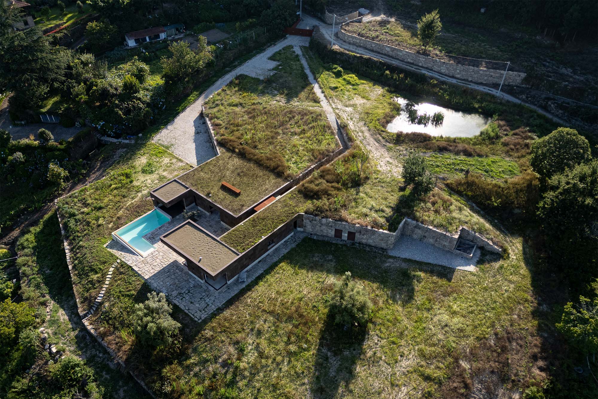 Diseñada por la firma portuguesa Tsou Arquitectos, esta casa surge horizontal sobre una colina de pendiente suave. Vista desde arriba, la construcción se camufla gracias a sus cubiertas ajardinadas y sus muros de piedra; la idea era mimetizar la vivienda, por lo que sus líneas rectas quedan apenas esbozadas en el paisaje.
