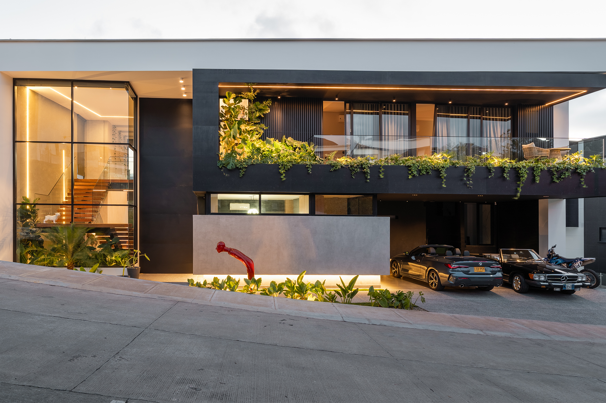 Desde la primera impresión, la casa manifiesta esta filosofía. Una imponente puerta de doble altura recibe al visitante. A un lado, una caja de cristal contiene la escalera principal, visible desde distintos ángulos y convertida en un elemento icónico del diseño. Al otro extremo, un garaje descubierto y un amplio balcón en el segundo nivel integran las habitaciones auxiliares con el exterior.