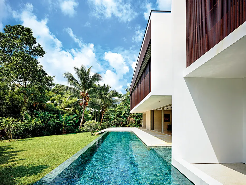 Dos volúmenes compactos, pero a la vez livianos y abiertos al paisaje, resumen el programa de esta vivienda en Singapur, creada para albergar de manera cómoda diferentes generaciones de una misma familia.