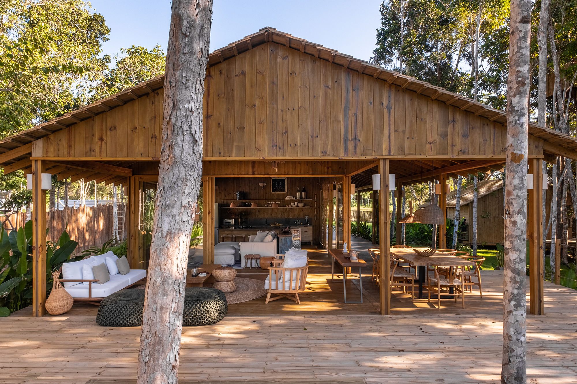 La cubierta, compuesta por tejas de pino curado en autoclave y con amplios aleros, protege la estructura de la radiación solar directa, mientras que el piso elevado facilita la permeabilidad del terreno, creando un área técnica que alberga discretamente los equipos necesarios.