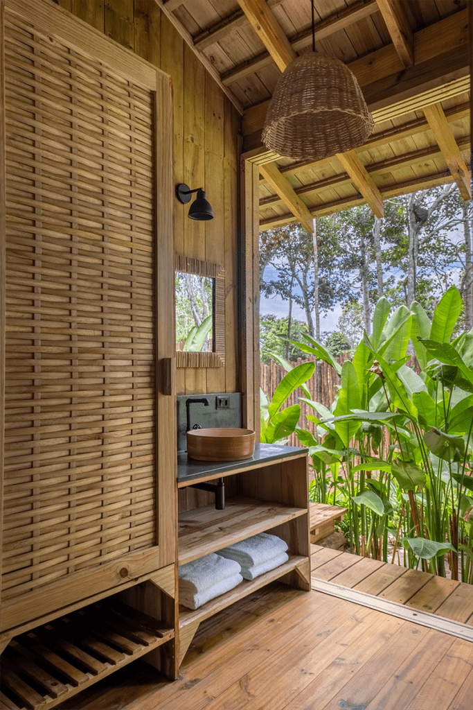 Los pilares y vigas de pino curado en autoclave, junto con los pilotes redondos de eucalipto, son la base sólida de cada módulo, fortaleciendo aún más la conexión con la naturaleza. Por otro lado, los muros dobles, construidos con pino curado en autoclave, no sólo aseguran un excelente aislamiento térmico y acústico, sino que también incorporan de manera inteligente las instalaciones hidráulicas y eléctricas, optimizando el espacio y los recursos.