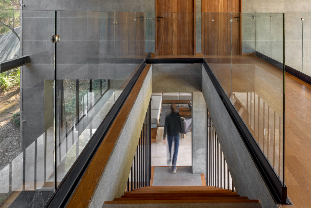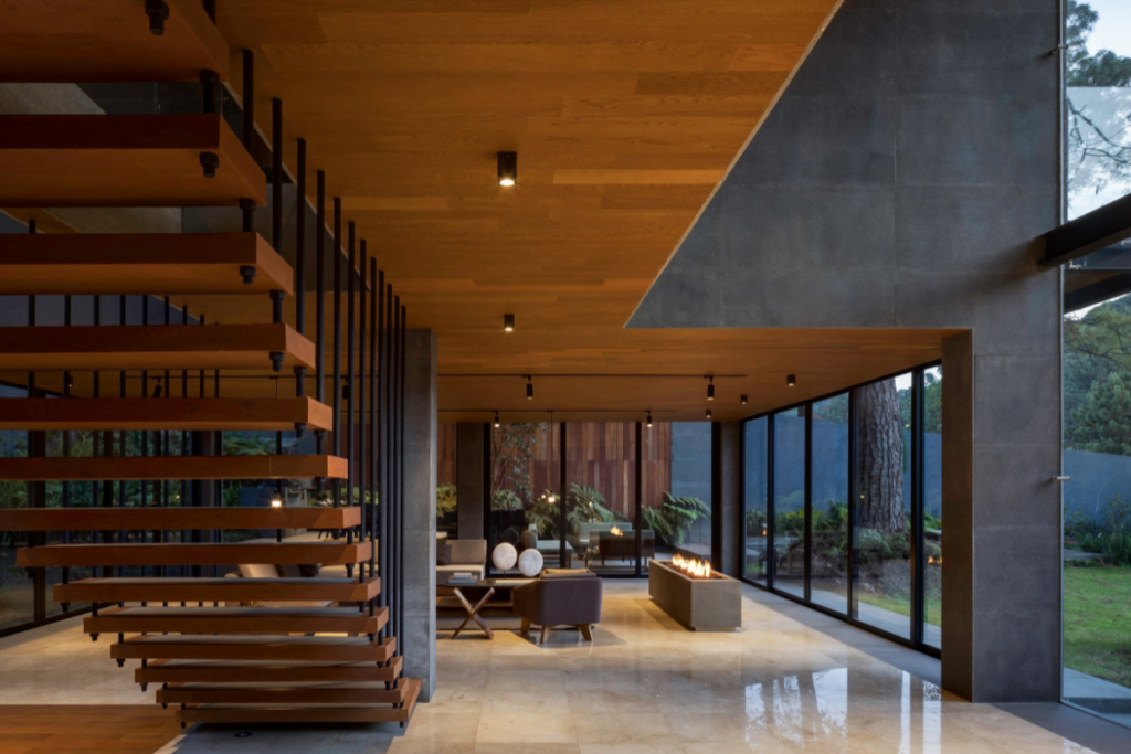 La escalera, con huellas de basalto –un tipo de roca– y bordes de madera, es otro elemento compositivo protagónico. Permanece colgada de la losa superior con tensores, se convierte en una circulación permeable, una transición armoniosa entre los componentes del programa. Y para dejar libre la vista desde cualquier punto de la sala, los arquitectos diseñaron la chimenea deliberadamente baja. Gesto que también acentúa la altura del espacio.