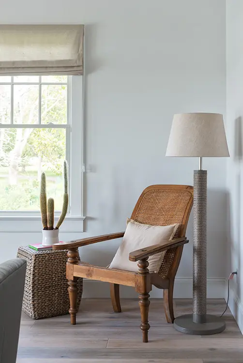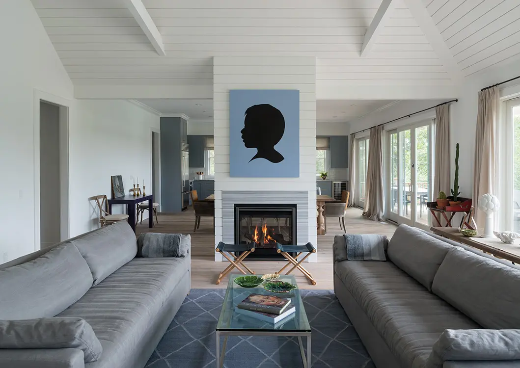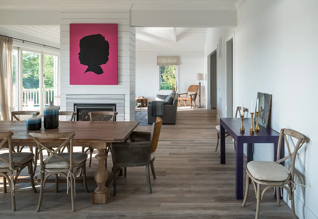 Moggio explica que los tonos neutros son la base perfecta para un espacio grande porque permiten un juego con colores más vivos en accesorios y obras de arte. Basta con darse un paseo por la sala y el comedor para refrendar su idea. Así pues, el lenguaje y la paleta que recorre la vivienda se entrevera con un puf de cuero de vaca o con un par de cómodas sillas balinesas que estuvieron almacenadas durante años en una bodega hasta que encontraron su lugar perfecto en esta casa de verano en los Hamptons.