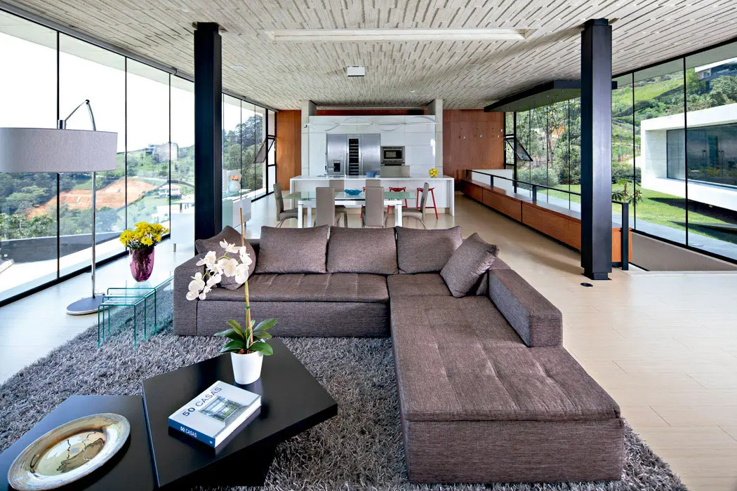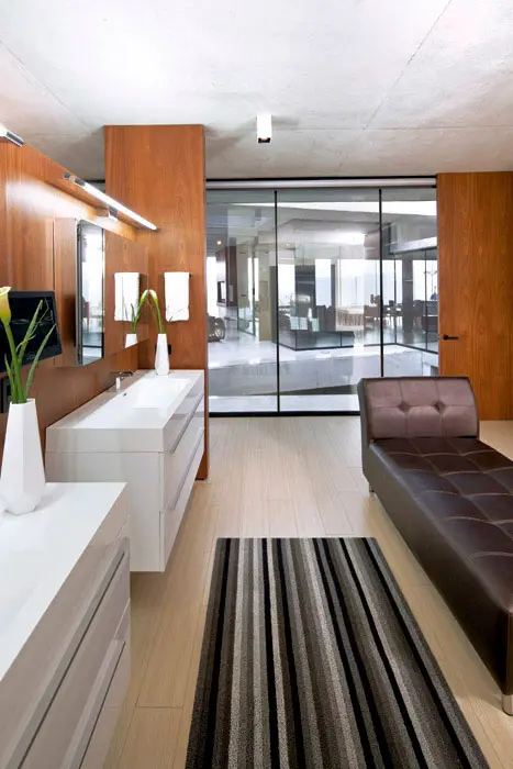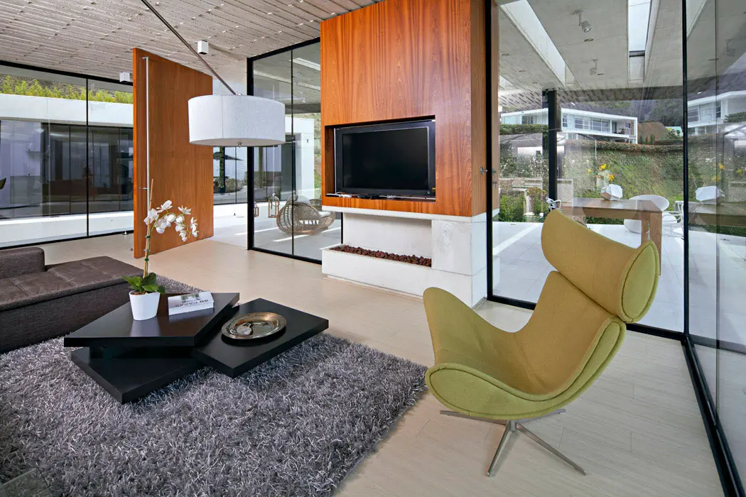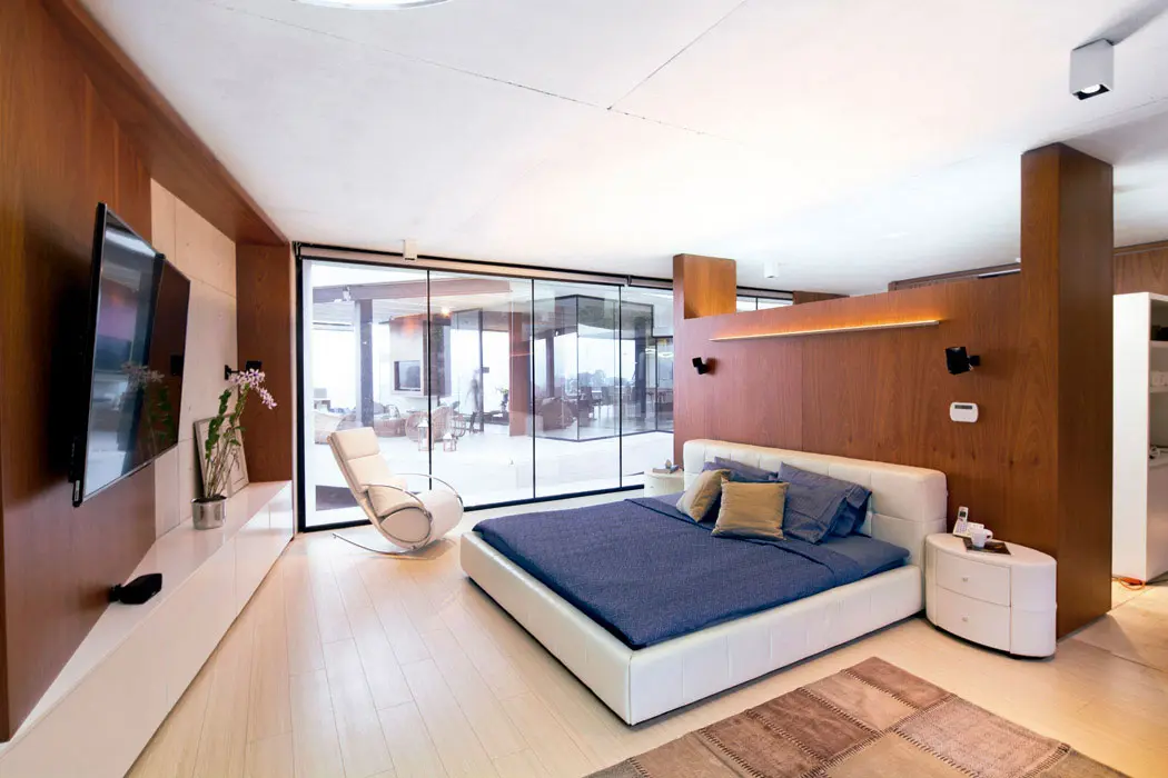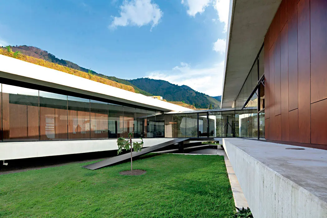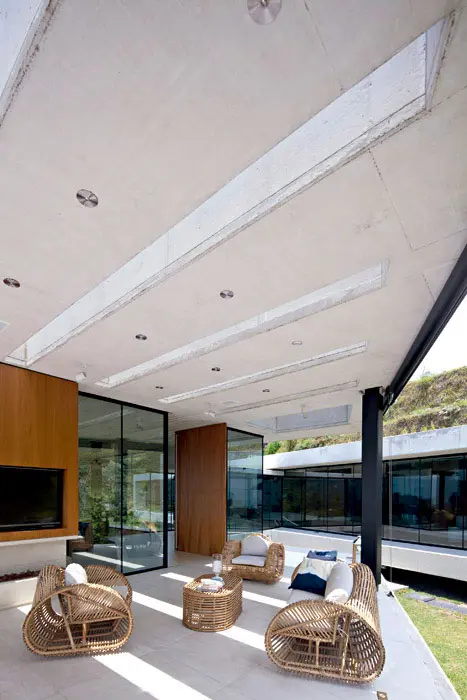 Entradas de luz en la cubierta plana marcan sutilmente la transición entre los ambientes. Un corredor de vidrio pasa sobre el espejo de agua del patio abierto al paisaje para llegar al volumen posterior, donde están las habitaciones de los niños, aisladas de la alcoba principal por medio de un estudio, que se puede habilitar como un dormitorio para huéspedes.