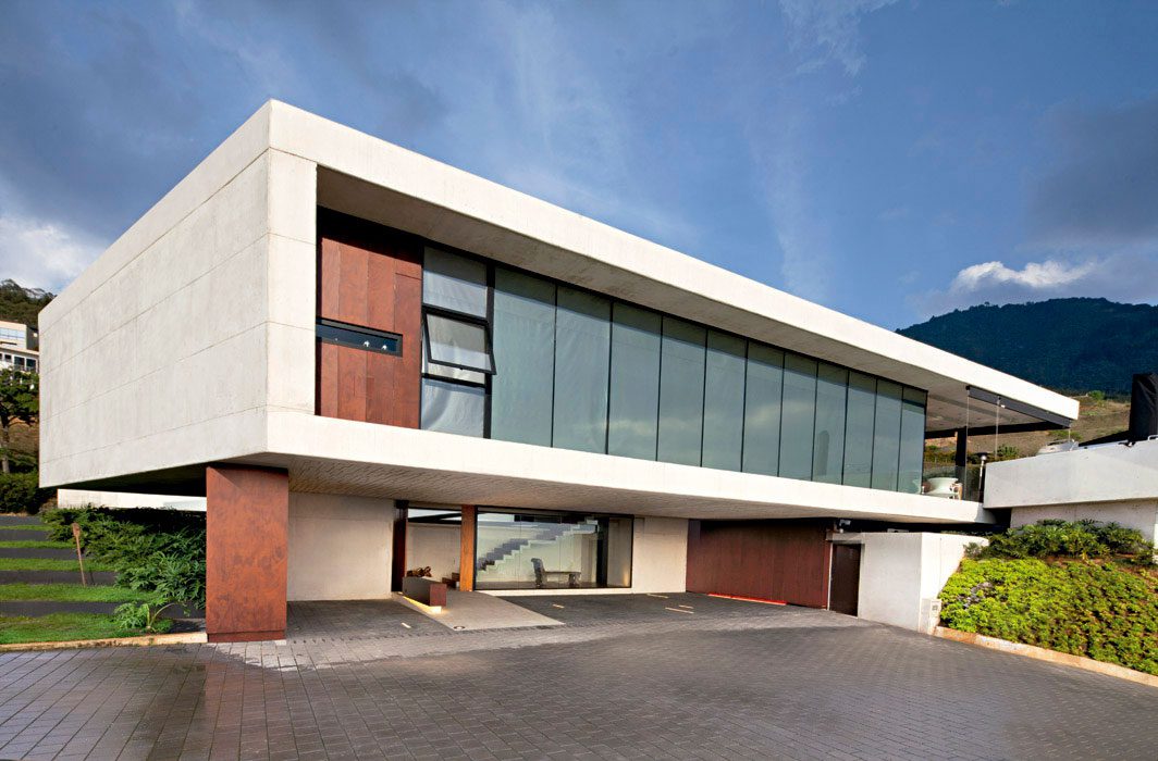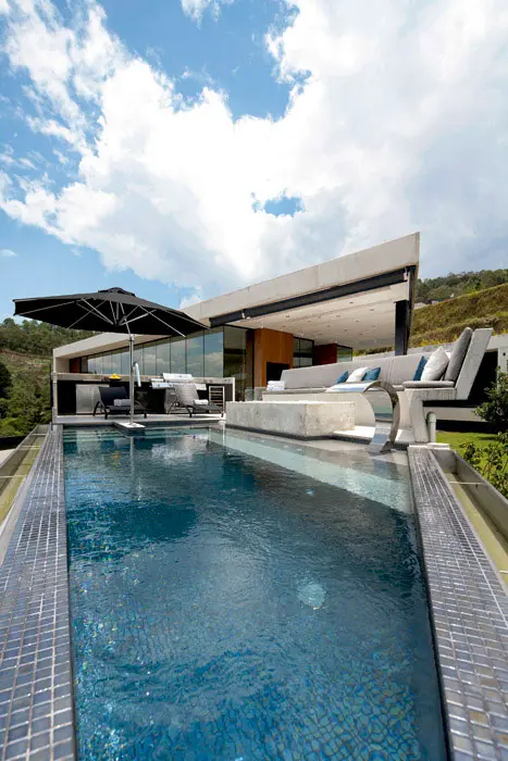 Dos volúmenes alargados que se abren como una tijera, vinculados por un espejo de agua, resumen el esquema de esta casa familiar con vista sobre Medellín. Un Diseño de los arquitectos Diego López y Nathalie Montoya
