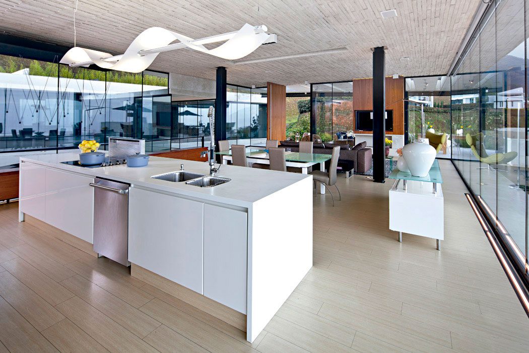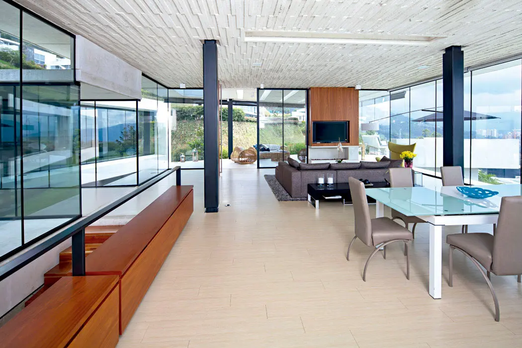 Acorde con la sencillez y el carácter moderno de la casa, el diseño interior, a cargo de María Isabel Mejía, de LM Arquitectos, está basado en una gama que refleja los tonos de la madera, el concreto y el mármol como se registra en el ambiente social, donde la cocina blanca, la mesa con tapa de vidrio del comedor y el sofá en “L” de la sala, tapizado en lino tabaco, sobre un tapete de hebras largas gris pizarra, armonizan con los materiales y complementan el sentido de los espacios abiertos a la luz y al paisaje.