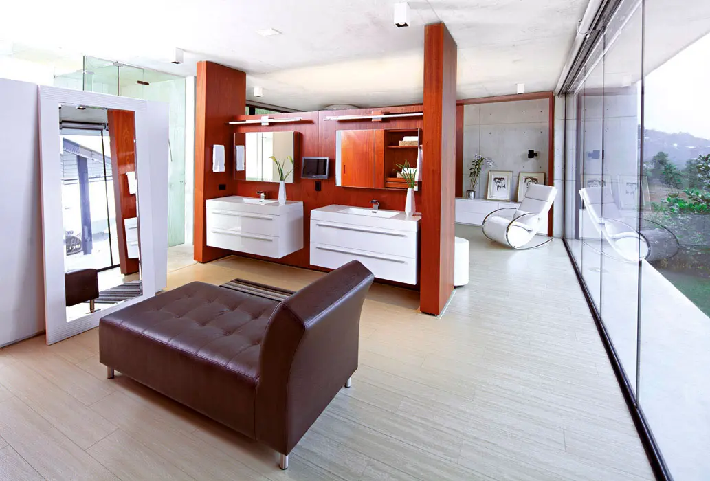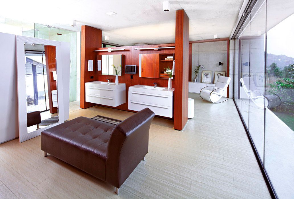 La formación en arquitectura de la dueña de casa y la amistad de largos años de su esposo con Diego López ambientaron un proceso de diseño que tomó partido por el racionalismo moderno y por una selecta gama de materiales: concreto, mármol travertino, vidrio y madera, que interactúan con la luz, el aire y el agua.