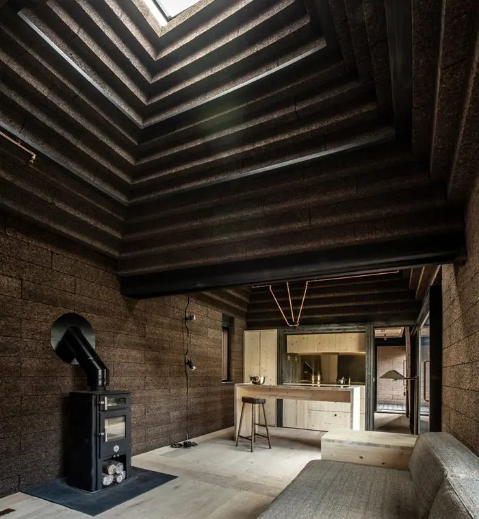 Cork House es una nueva forma simple de construcción basada en plantas. Las paredes monolíticas y los techos corbelados están hechos casi en su totalidad de corcho sólido de carga. Este kit de construcción -autoconstrucción- es altamente innovador y está diseñado para el desmontaje, además es negativo en carbono, con una vida útil de 60 años, el carbono de vida útil más bajo para cualquier edificio que han evaluado.