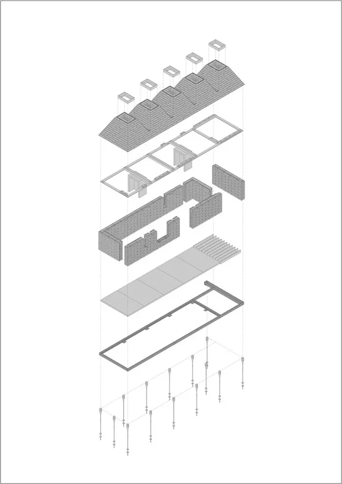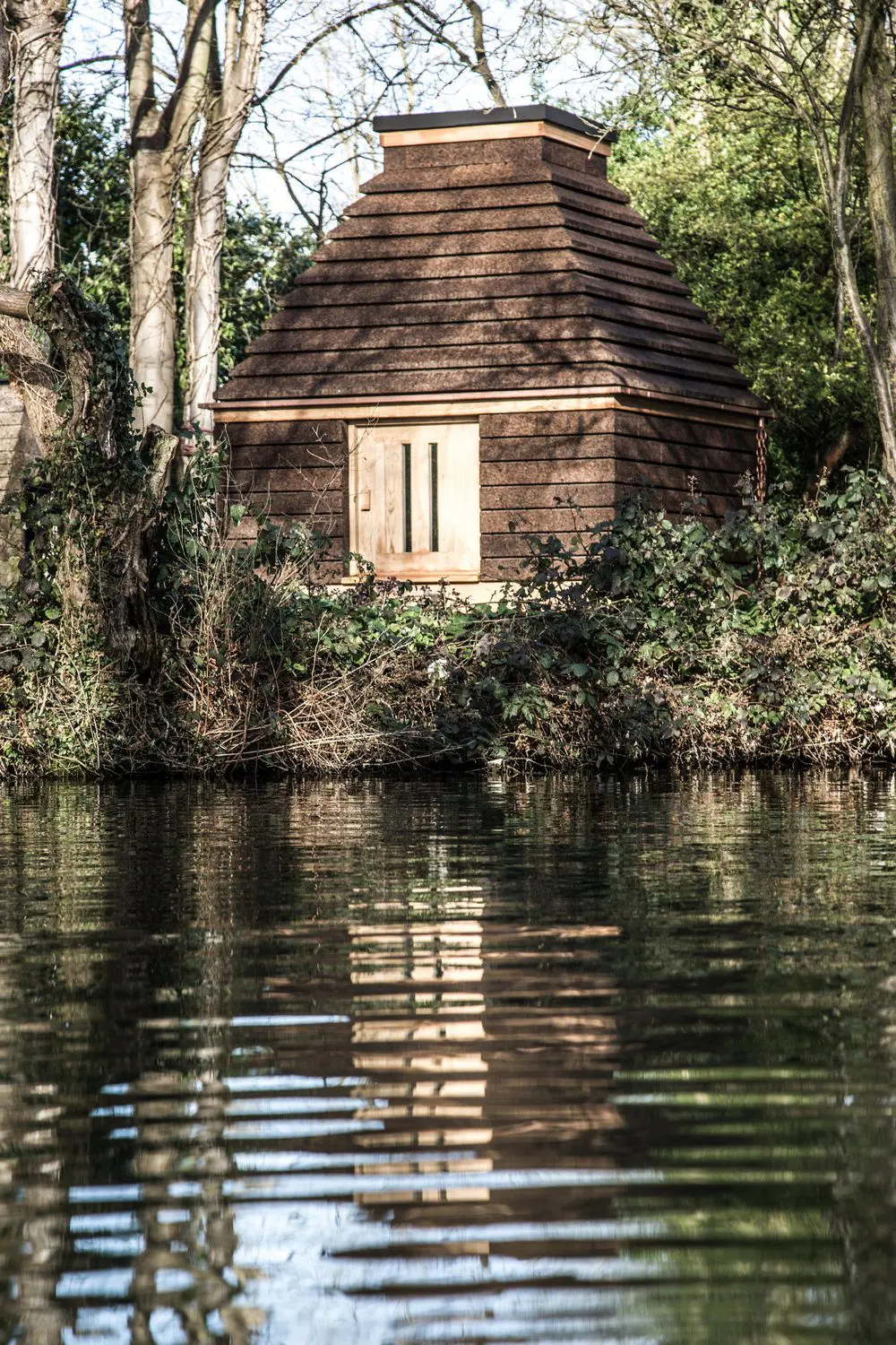 A partir de esta combinación de objetivos arquitectónicos y ecológicos, la forma estructural es nueva y familiar: una reinvención progresiva de los principios de construcción simples de estructuras de piedra antiguas como las casas de colmena celtas. Internamente, el corcho sólido expuesto crea un ambiente sensorial evocador: las paredes son suaves al tacto e incluso huelen bien, la acústica es suave y tranquila, y las tuberías de cobre brillan en las sombras de las pirámides del techo acanalado.