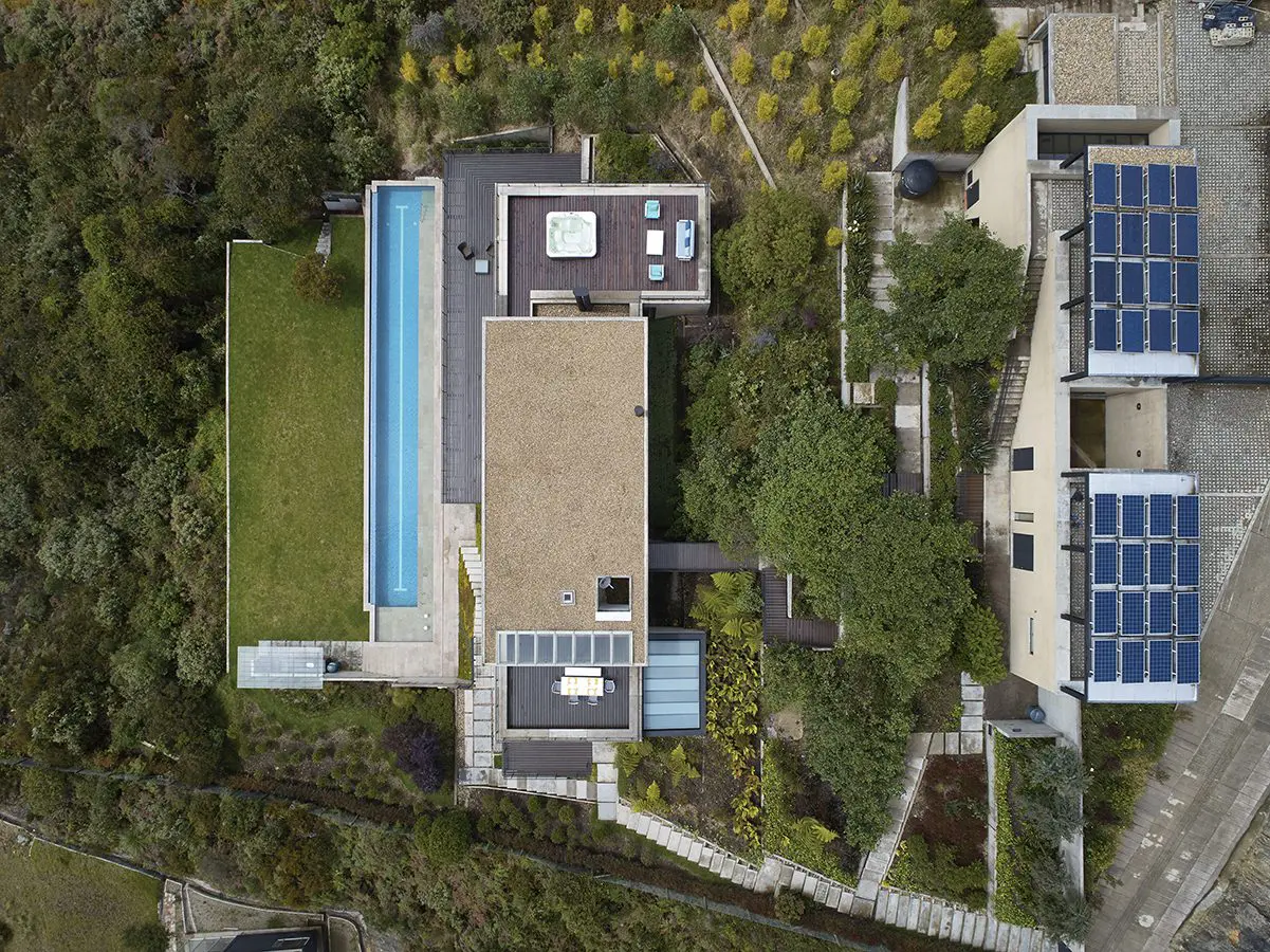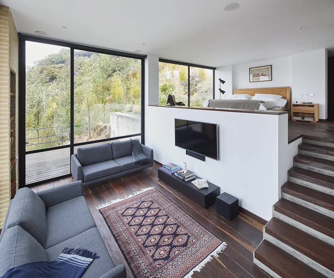 A pesar de estar ubicado a tan solo veinte minutos del ruido, la congestión y el agite que caracterizan a la ciudad de Bogotá, el lugar en que se sitúa esta casa se encuentra totalmente desconectado de la urbe. Embebida en su entorno natural, llena de tranquilidad, oxígeno, agua y naturaleza, la casa cumple a cabalidad con el objetivo para el cual fue diseñada: proveer un espacio de descanso y de relajación para sus habitantes.