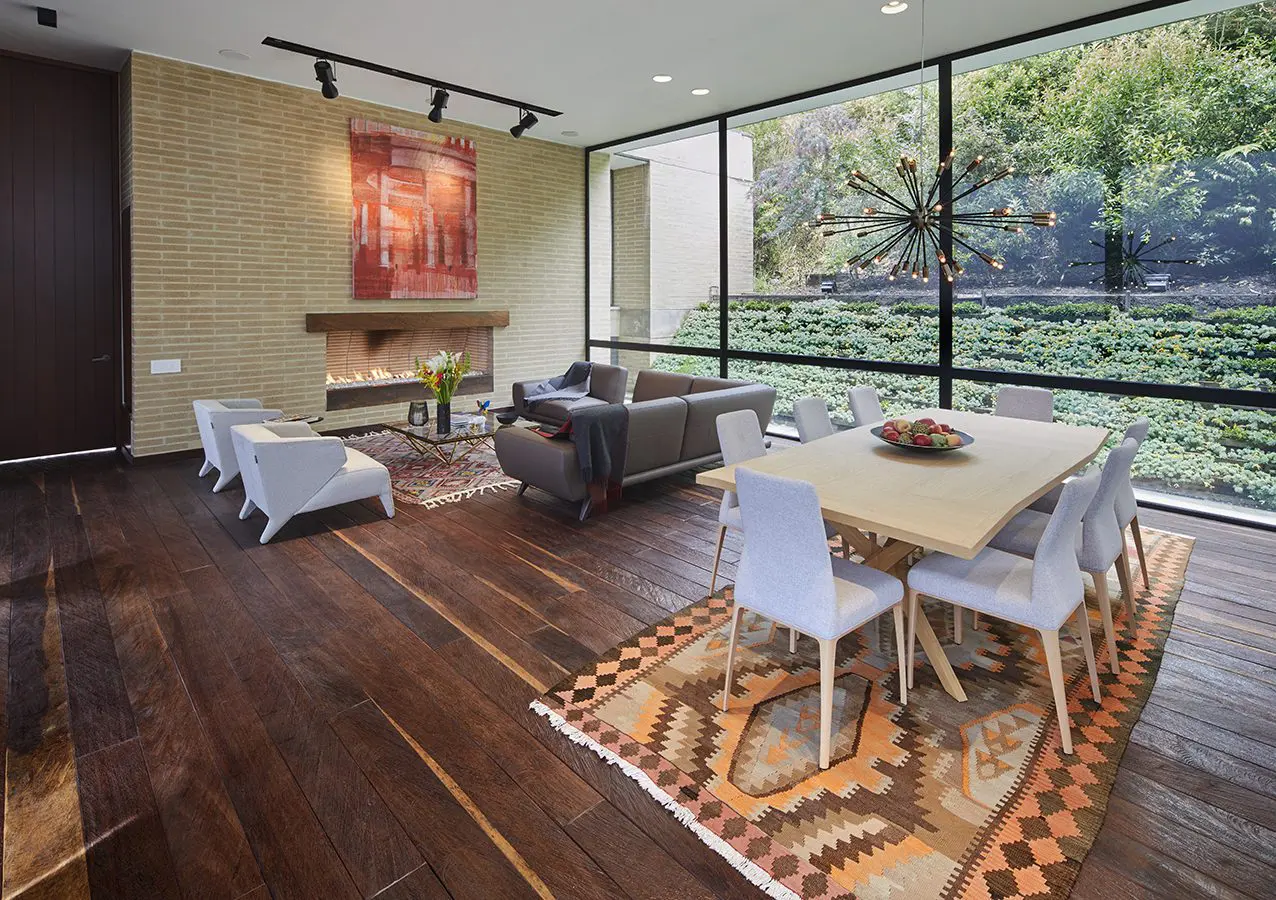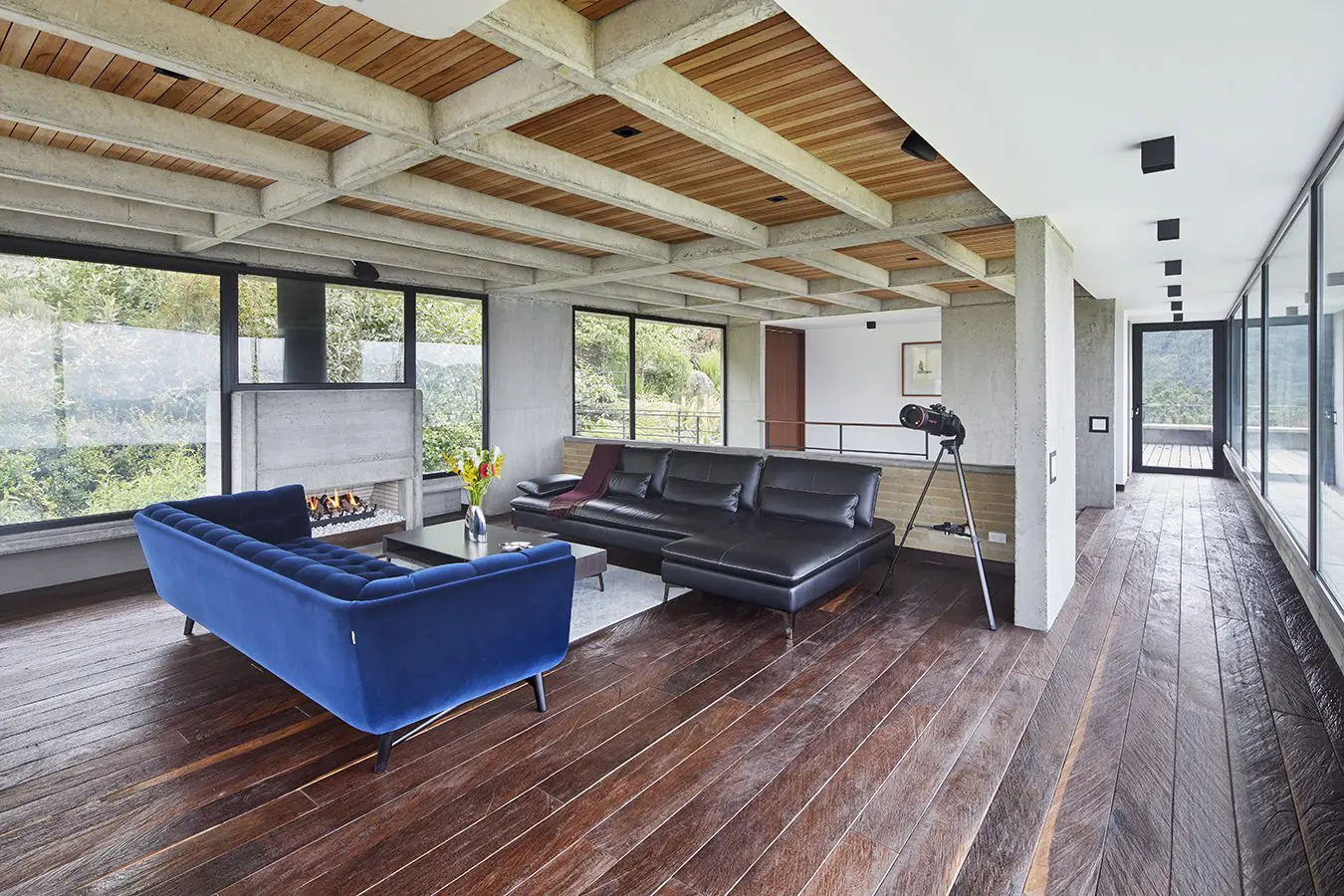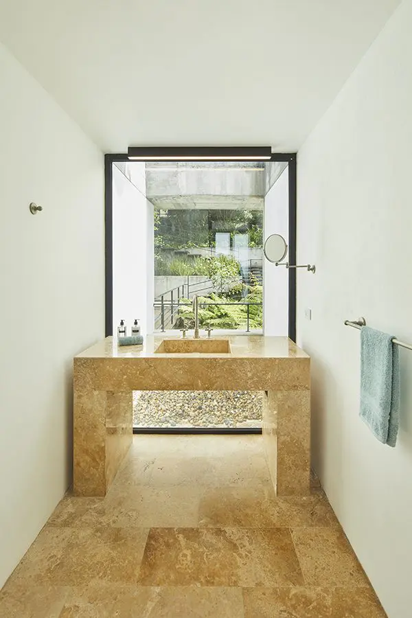 La doble relación, con la vista lejana (el embalse) y la cercana (el bosque), se percibe desde todos los espacios, tanto en los de carácter público como en los privados. A partir de los grandes ventanales y de una secuencia de terrazas, patios y áreas de uso exterior, los arquitectos difuminaron los límites entre el interior y su entorno, incorporando la naturaleza circundante a los ambientes habitables.