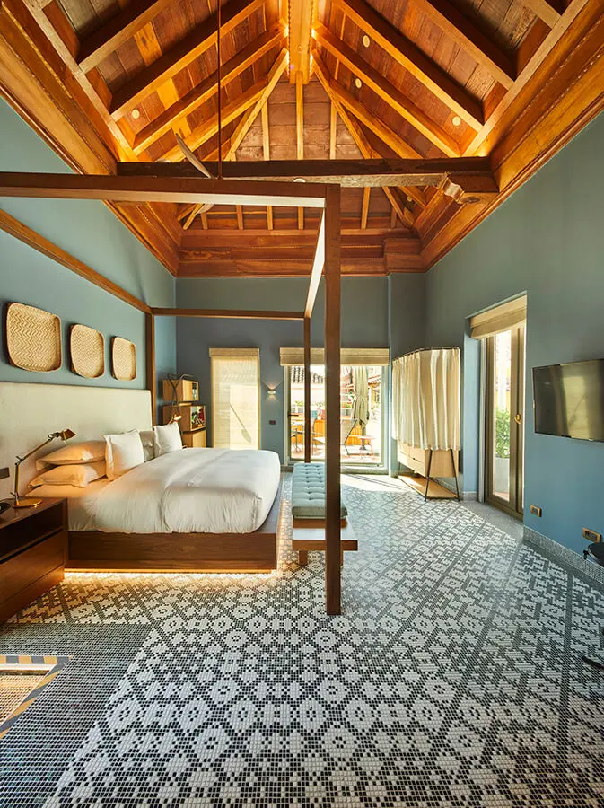Los colores escogidos para las habitaciones varían según el grupo al que pertenezcan; las puede haber pintadas de verde y blanco o beige y blanco. En los acabados se instalaron piezas de mármol y madera, que le aportan elegancia, calidez y un toque de sensualidad. El mobiliario se caracteriza por la presencia de fibras naturales como cuero, lino y algodón orgánico.